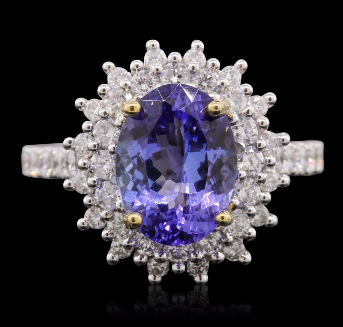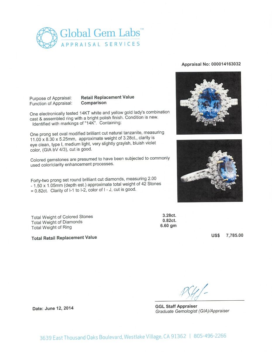 One electronically tested 14KT white and yellow gold Ladies combination cast & assembled ring with a bright polish finish. Condition is new. Identified with markings of "14K". Containing: One prong set oval modified brilliant cut natural tanzanite, measuring 11.00. x 8.30 x 5.25mm, approximate weight of 3.28ct., clarity is eye clean, type I, medium light, very slightly grayish, bluish violet color, (GIA bV 4/3), cut is good. Colored gemstones are presumed to have been subjected to commonly used color/clarity enhancement processes. Forty-Two prong set round brilliant cut diamonds, measuring 2.00. - 1.50 x 1.05mm (depth est.) approximate. Total Weight of 42 Stones = 0.82ct. . Clarity: I-1 to I-2. Color: I - J, Cut is Good. . Total Weight of Colored Stones 3.28ct. Total Weight of Diamonds 0.82ct. Total Weight of Ring 6.60 grams. GGL Appraised at $7,785.00.