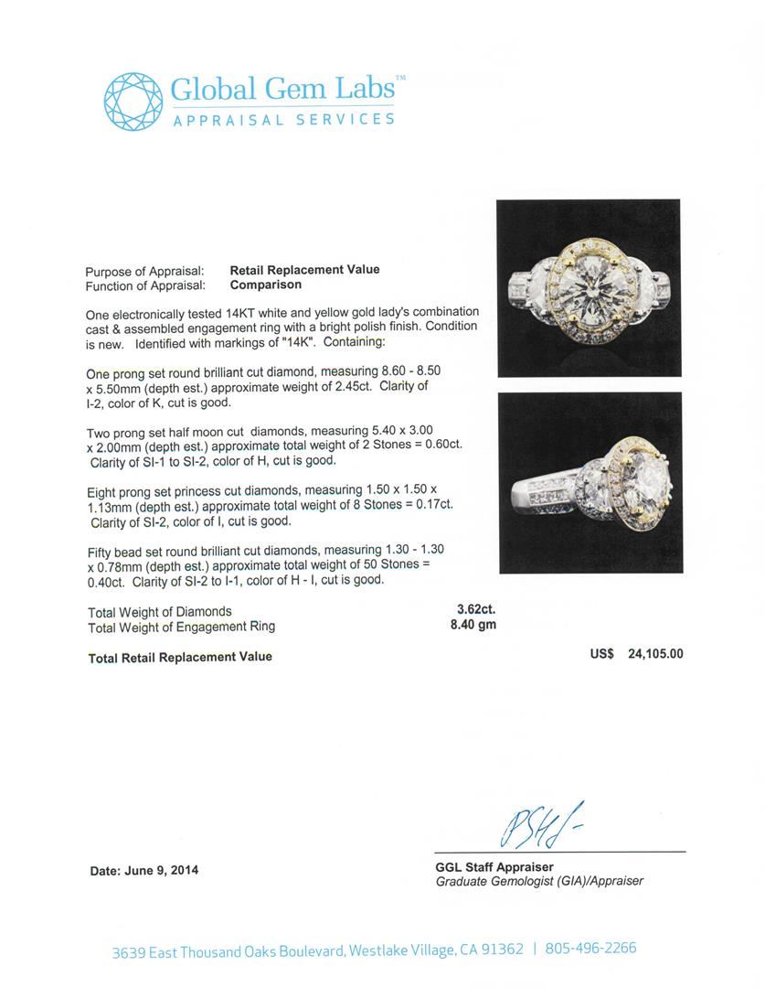 One electronically tested 14KT white and yellow gold Ladies combination cast & assembled engagement ring with a bright polish finish. Condition is new. Identified with markings of "14K". Containing: One prong set round brilliant cut diamond, measuring 8.60 - 8.50 x 5.50mm (depth est.) approximate weight of 2.45ct. Clarity: I-2. Color: K, Cut is Good. Two prong set half moon cut diamonds, measuring 5.40 x 3.00 x 2.00mm (depth est.) approximate. Total Weight of 2 Stones = 0.60ct. Clarity: SI-1 to SI-2. Color: H, Cut is Good. Eight prong set princess cut diamonds, measuring 1.50 x 1.50 x 1.13mm (depth est.) approximate. Total Weight of 8 Stones = 0.17ct. Clarity: SI-2. Color: I, Cut is Good. Fifty bead set round brilliant cut diamonds, measuring 1.30 - 1.30 x 0.78mm (depth est.) approximate. Total Weight of 50 Stones = 0.40ct. Clarity: SI-2 to I-1. Color: H - I, Cut is Good. Total Weight of Diamonds 3.62ct. Total Weight of Engagement Ring 8.40 grams. GGL Appraised at $24,105.00.