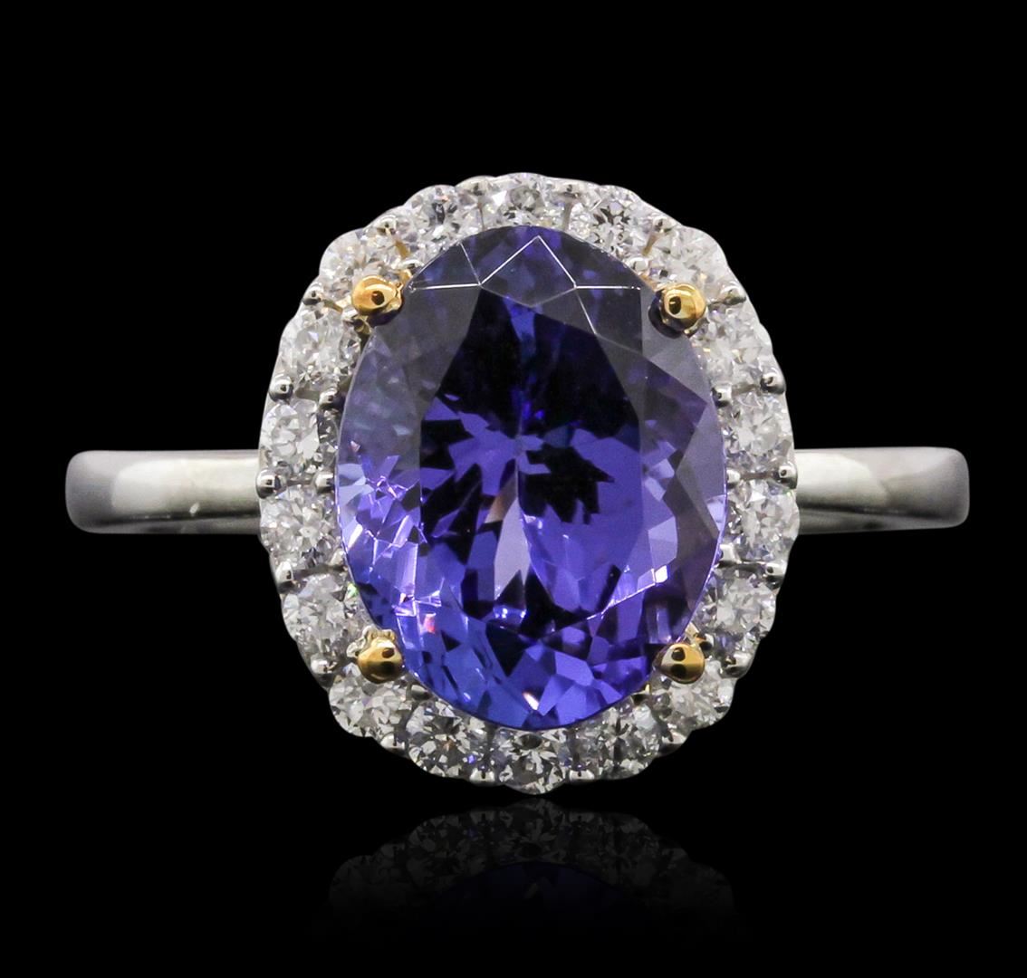 One electronically tested 14KT white and yellow gold Ladies combination cast & assembled ring with a bright polish finish. Condition is new. Identified with markings of "14K". Containing: Eighteen prong set round brilliant cut diamonds, measuring 1.70 - 1.70 x 1.02mm (depth est.) approximate. Total Weight of 18 Stones = 0.53ct. Clarity: I-1 to I-2. Color: I - J, Cut is Good. One prong set oval modified brilliant cut natural tanzanite, measuring 12.00 x 8.00 x 5.20mm, approximate weight of 3.90ct., clarity is eye clean, type I, medium dark, moderately strong, bluish violet color, (GIA bV 6/4), cut is very good. Colored gemstones are presumed to have been subjected to commonly used color/clarity enhancement processes. Total Weight of Colored Stones 3.90ct. Total Weight of Diamonds 0.53ct. Total Weight of Ring 4.30 grams. GGL Appraised at $7,815.00.