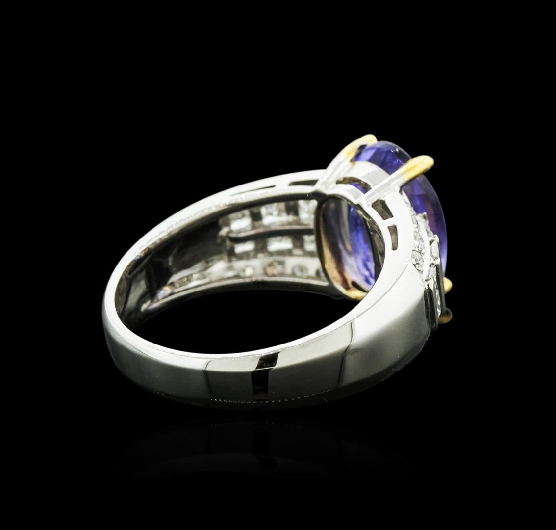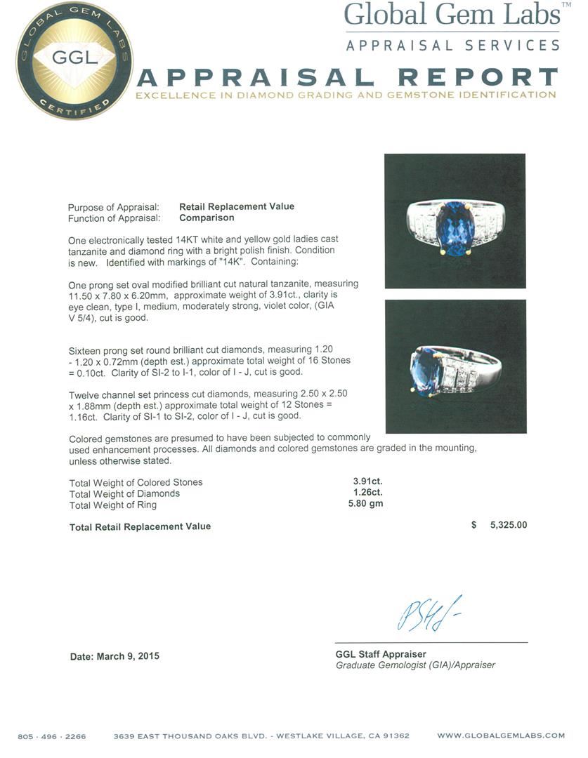 One electronically tested 14KT white and yellow gold ladies cast tanzanite and diamond ring with a bright polish finish. Identified with markings of "14K". Condition is new. Containing: One prong set oval modified brilliant cut natural tanzanite, measuring 11.50 x 7.80 x 6.20mm, approximate weight of 3.91ct., clarity is eye clean, type I, medium, moderately strong, violet color, (GIA V 5/4), cut is good. Sixteen prong set round brilliant cut diamonds, measuring 1.20 - 1.20 x 0.72mm (depth est.) approximate total weight of 16 Stones = 0.10ct. Clarity: SI-2 to I-1. Color: I - J, Cut is Good. Twelve channel set princess cut diamonds, measuring 2.50 x 2.50 x 1.88mm (depth est.) approximate total weight of 12 Stones = 1.16ct. Clarity: SI-1 to SI-2. Color: I - J, Cut is Good. Colored gemstones are presumed to have been subjected to commonly used enhancement processes. All diamonds and colored gemstones are graded in the mounting, unless otherwise stated. Total Weight of Colored Stones 3.91ct. Total Weight of Diamonds 1.26ct. Total Weight of Ring 5.80 grams. GGL Appraised at $5,325.00.