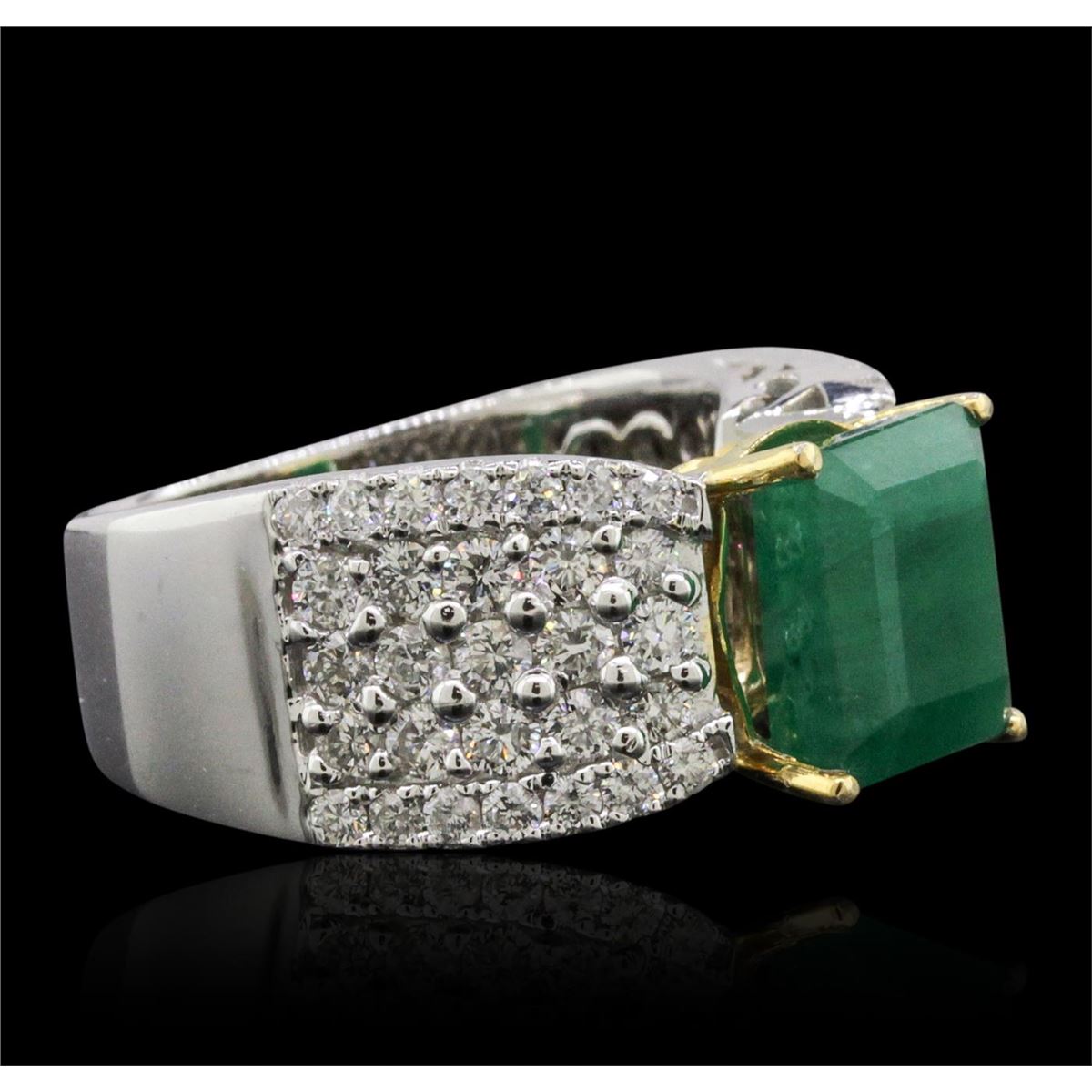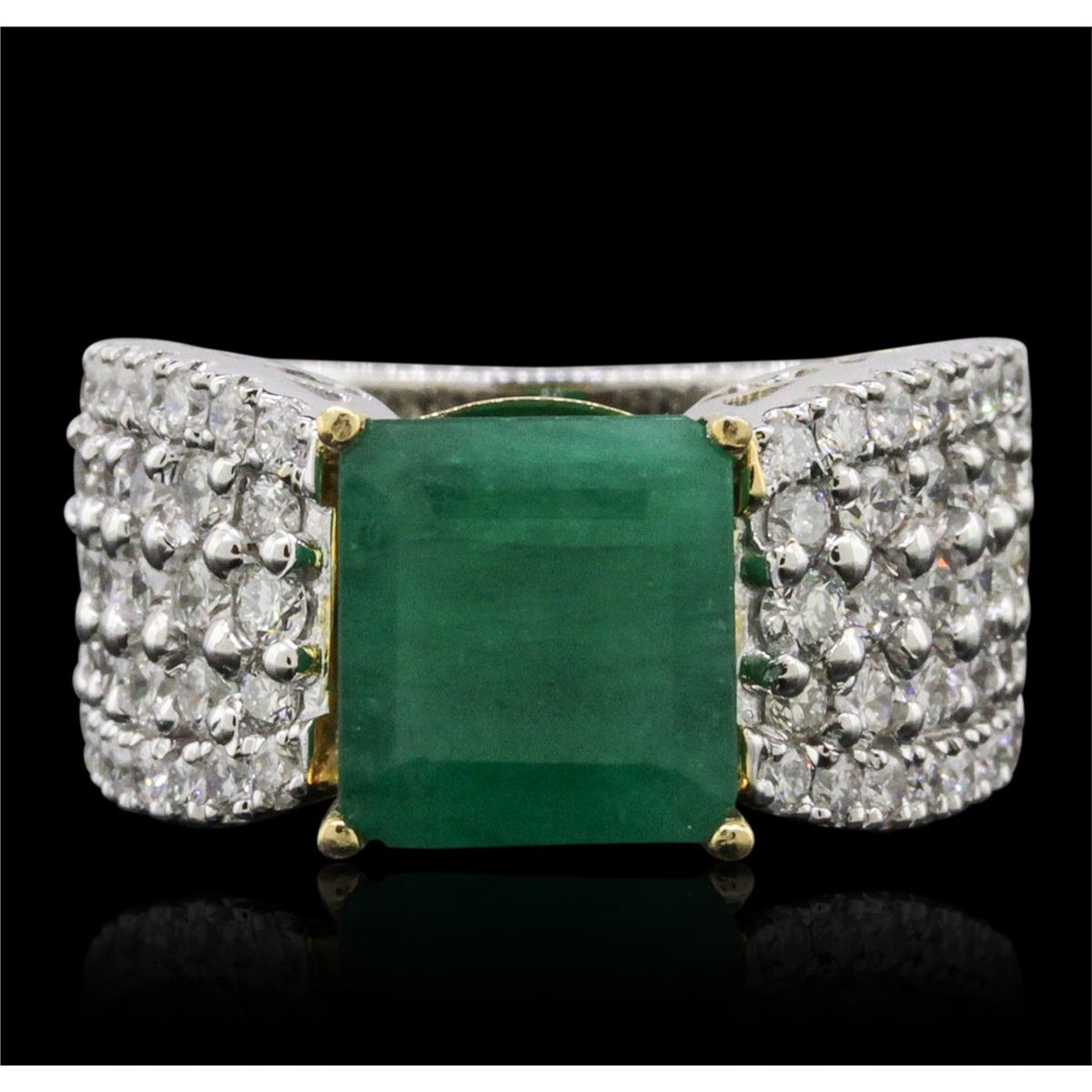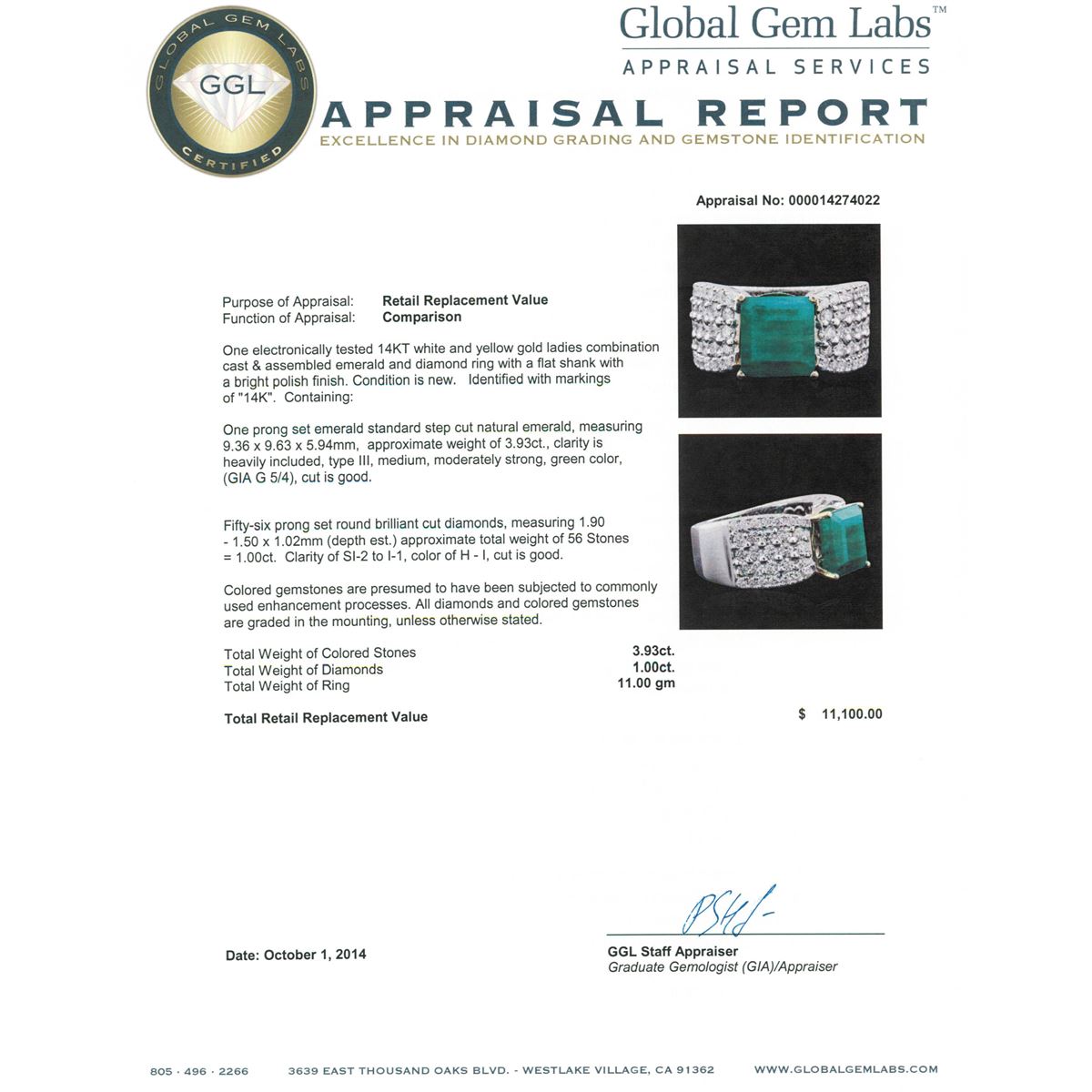 One electronically tested 14KT white and yellow gold ladies combination cast & assembled emerald and diamond ring with a flat shank with a bright polish finish. Identified with markings of "14K". Condition is new. Containing: One prong set emerald standard step cut natural emerald, measuring 9.36 x 9.63 x 5.94mm, approximate weight of 3.93ct., clarity is heavily included, type III, medium, moderately strong, green color, (GIA G 5/4), cut is good. Fifty-Six prong set round brilliant cut diamonds, measuring 1.90 - 1.50 x 1.02mm (depth est.) approximate total weight of 56 Stones = 1.00.ct. Clarity: SI-2 to I-1. Color: H - I, Cut is Good. Colored gemstones are presumed to have been subjected to commonly used enhancement processes. All diamonds and colored gemstones are graded in the mounting, unless otherwise stated. Total Weight of Colored Stones 3.93ct. Total Weight of Diamonds 1.00.ct. Total Weight of Ring 11.00. grams. GGL Appraised at $11,100.00.