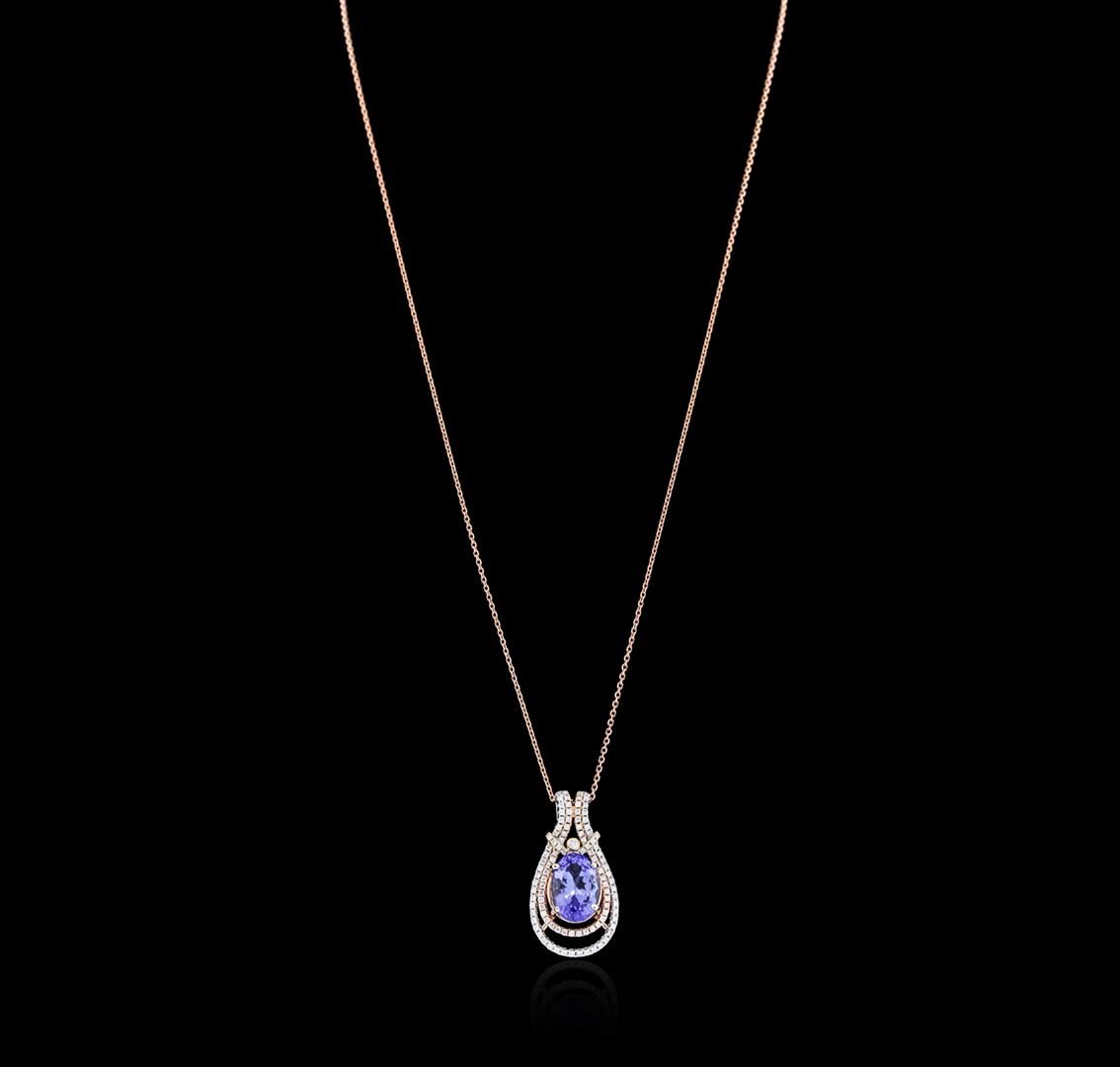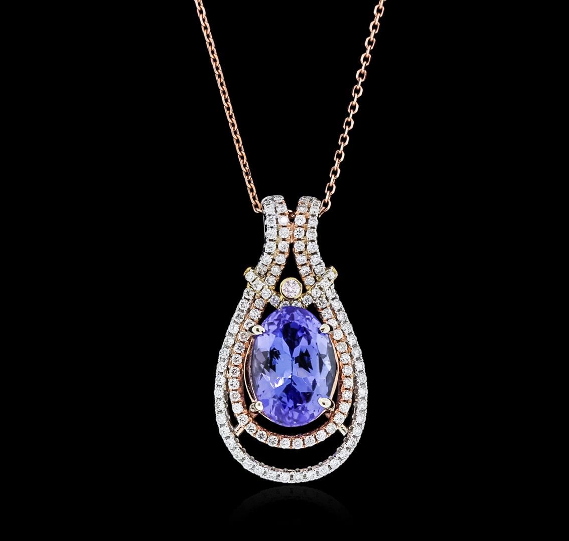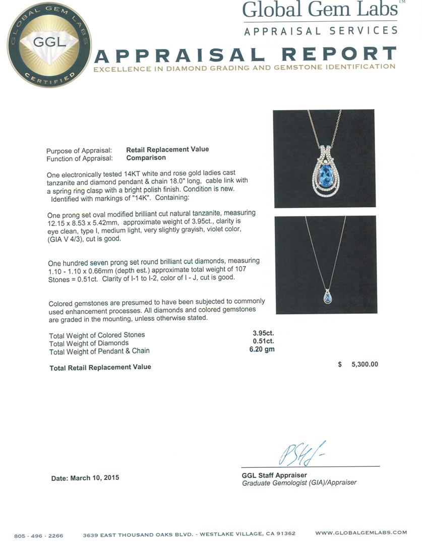 One electronically tested 14KT white and rose gold ladies cast tanzanite and diamond pendant & chain 18.0" long, cable link with a spring ring clasp with a bright polish finish. Identified with markings of "14K". Condition is new. Containing: One prong set oval modified brilliant cut natural tanzanite, measuring 12.15 x 8.53 x 5.42mm, approximate weight of 3.95ct., clarity is eye clean, type I, medium light, very slightly grayish, violet color, (GIA V 4/3), cut is good. One Hundred Seven prong set round brilliant cut diamonds, measuring 1.10 - 1.10 x 0.66mm (depth est.) approximate total weight of 107 Stones = 0.51ct. Clarity: I-1 to I-2. Color: I - J, Cut is Good. Colored gemstones are presumed to have been subjected to commonly used enhancement processes. All diamonds and colored gemstones are graded in the mounting, unless otherwise stated. Total Weight of Colored Stones 3.95ct. Total Weight of Diamonds 0.51ct. Total Weight of Pendant & Chain 6.20 grams. GGL Appraised at $5,300.00.
