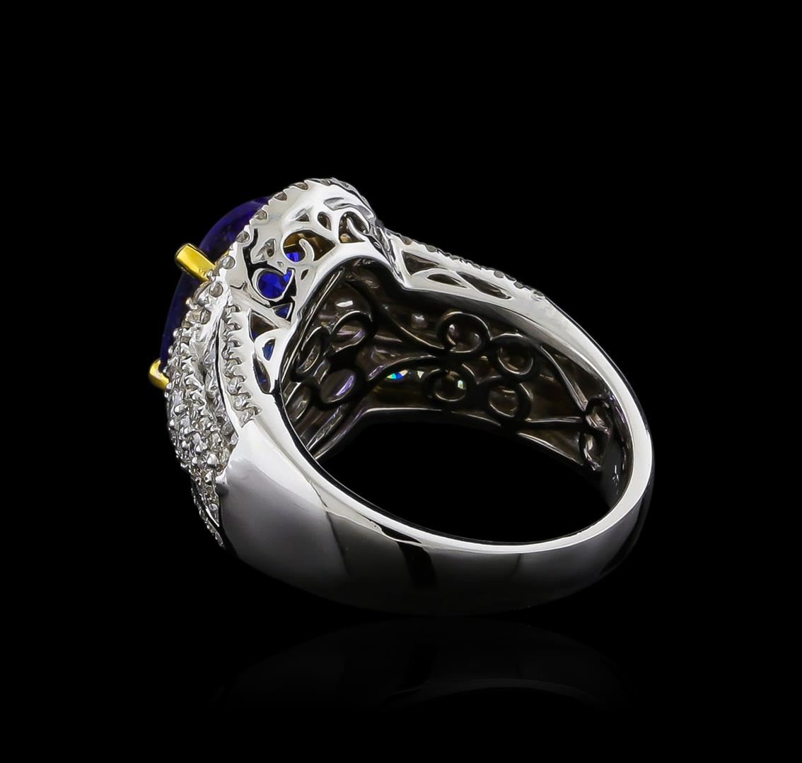 One electronically tested 14KT white and yellow gold ladies combination cast & assembled tanzanite and diamond ring with a tapered shank with a bright polish finish. Identified with markings of "14K". Condition is new. Containing: One prong set oval modified brilliant cut natural tanzanite, measuring 12.26 x 8.00 x 5.99mm, approximate weight of 4.12ct., clarity is eye clean, type I, medium, moderately strong, violet color, (GIA V 5/4), cut is good. Twenty-Eight prong set round brilliant cut diamonds, measuring 1.80 - 1.30 x 0.93mm (depth est.) approximate total weight of 28 Stones = 0.38ct. Clarity: I-1 to I-2. Color: J - K, Cut is Good. Colored gemstones are presumed to have been subjected to commonly used enhancement processes. All diamonds and colored gemstones are graded in the mounting, unless otherwise stated. Total Weight of Colored Stones 4.12ct. Total Weight of Diamonds 0.38ct. Total Weight of Ring 9.90 grams. GGL Appraised.