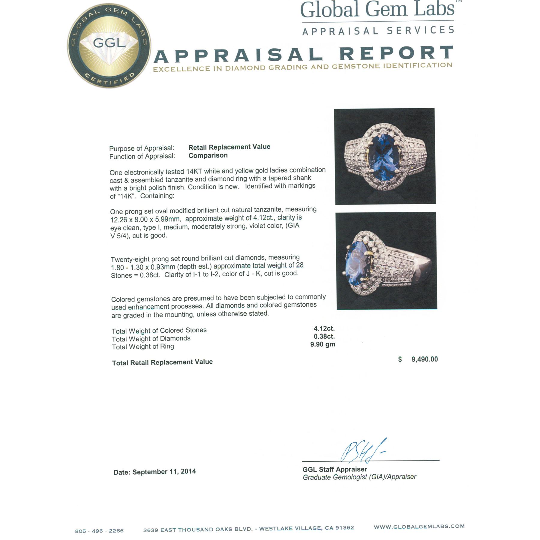 One electronically tested 14KT white and yellow gold ladies combination cast & assembled tanzanite and diamond ring with a tapered shank with a bright polish finish. Identified with markings of "14K". Condition is new. Containing: One prong set oval modified brilliant cut natural tanzanite, measuring 12.26 x 8.00 x 5.99mm, approximate weight of 4.12ct., clarity is eye clean, type I, medium, moderately strong, violet color, (GIA V 5/4), cut is good. Twenty-Eight prong set round brilliant cut diamonds, measuring 1.80 - 1.30 x 0.93mm (depth est.) approximate total weight of 28 Stones = 0.38ct. Clarity: I-1 to I-2. Color: J - K, Cut is Good. Colored gemstones are presumed to have been subjected to commonly used enhancement processes. All diamonds and colored gemstones are graded in the mounting, unless otherwise stated. Total Weight of Colored Stones 4.12ct. Total Weight of Diamonds 0.38ct. Total Weight of Ring 9.90 grams. GGL Appraised.