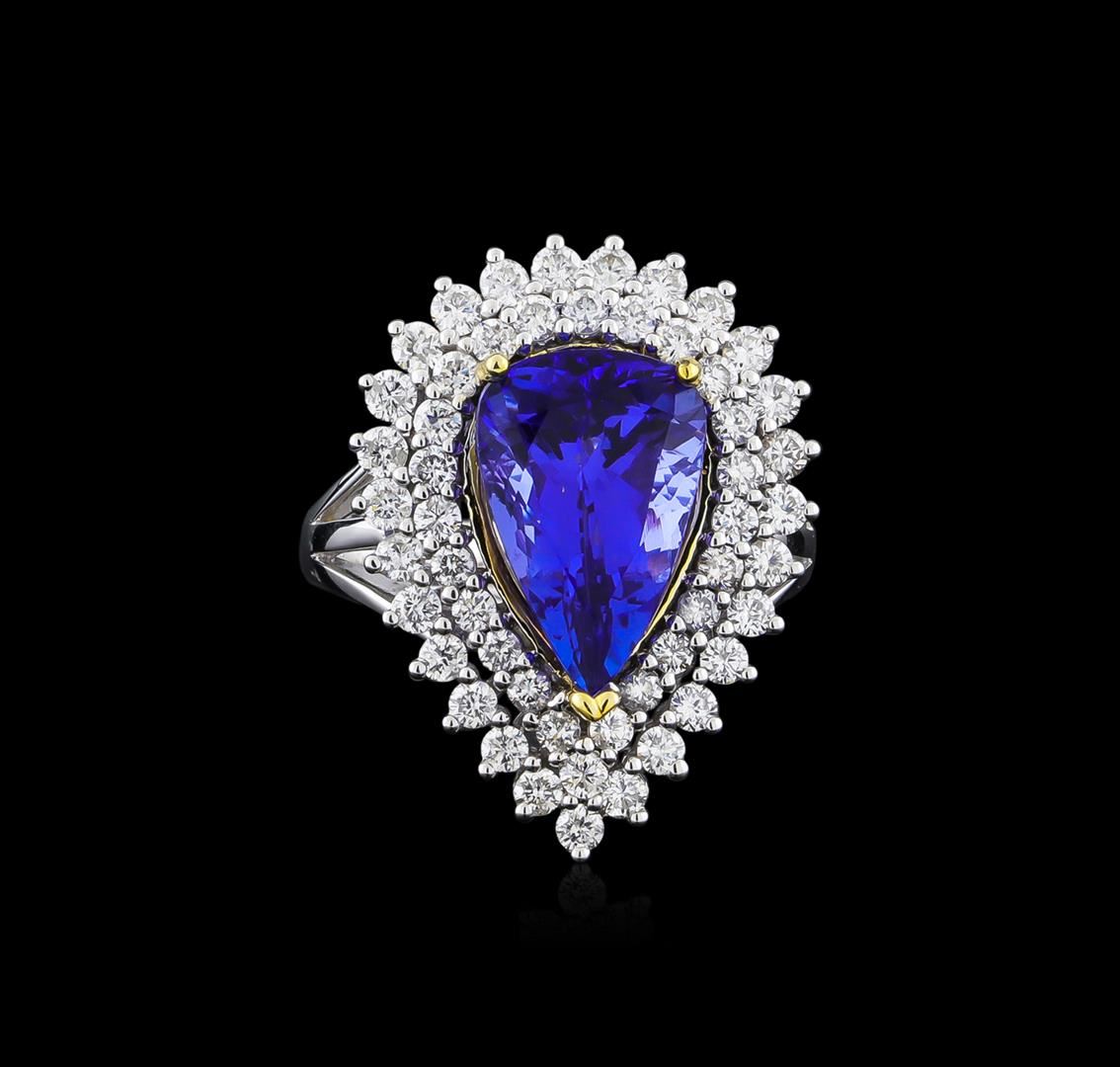 One electronically tested 14KT white and yellow gold ladies combination cast & assembled tanzanite and diamond ring with a flat shank with a bright polish finish. Identified with markings of "14K". Condition is new. Containing: One prong set pear modified brilliant cut natural tanzanite, measuring 14.00 x 9.21 x 4.78mm, approximate weight of 4.13ct., clarity is eye clean, type I, medium, moderately strong, bluish violet color, (GIA bV 5/4), cut is good. Fifty-Four prong set round brilliant cut diamonds, measuring 1.90 - 1.70 x 1.08mm (depth est.) approximate total weight of 54 Stones = 1.15ct. Clarity: I-1 to I-2. Color: I - J, Cut is Good. Colored gemstones are presumed to have been subjected to commonly used enhancement processes. All diamonds and colored gemstones are graded in the mounting, unless otherwise stated total weight of Colored Stones 4.13ct. Total Weight of Diamonds 1.15ct. Total Weight of Ring 8.50 grams. GGL Appraised at $10,470.00.