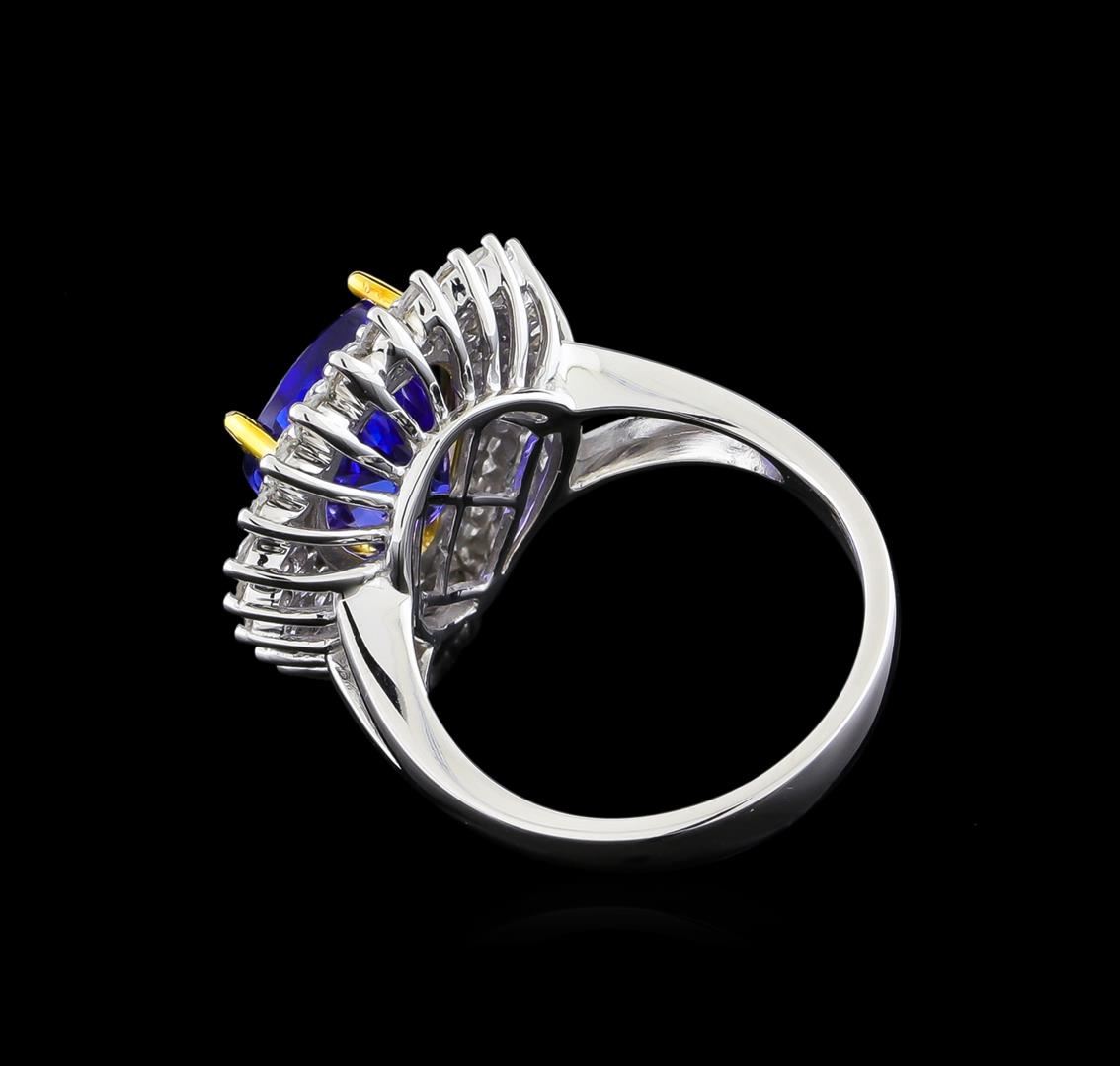One electronically tested 14KT white and yellow gold ladies combination cast & assembled tanzanite and diamond ring with a flat shank with a bright polish finish. Identified with markings of "14K". Condition is new. Containing: One prong set pear modified brilliant cut natural tanzanite, measuring 14.00 x 9.21 x 4.78mm, approximate weight of 4.13ct., clarity is eye clean, type I, medium, moderately strong, bluish violet color, (GIA bV 5/4), cut is good. Fifty-Four prong set round brilliant cut diamonds, measuring 1.90 - 1.70 x 1.08mm (depth est.) approximate total weight of 54 Stones = 1.15ct. Clarity: I-1 to I-2. Color: I - J, Cut is Good. Colored gemstones are presumed to have been subjected to commonly used enhancement processes. All diamonds and colored gemstones are graded in the mounting, unless otherwise stated total weight of Colored Stones 4.13ct. Total Weight of Diamonds 1.15ct. Total Weight of Ring 8.50 grams. GGL Appraised.