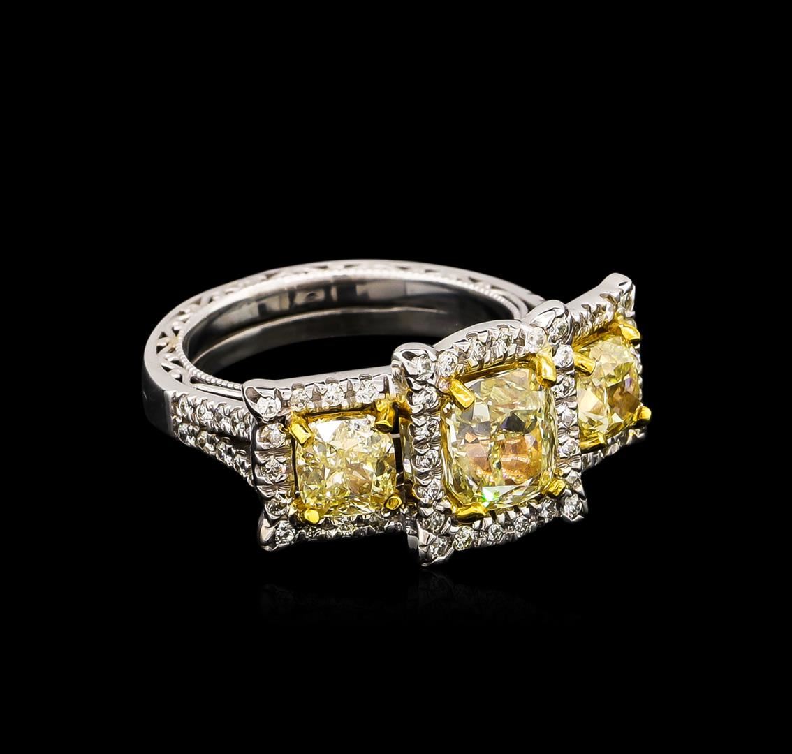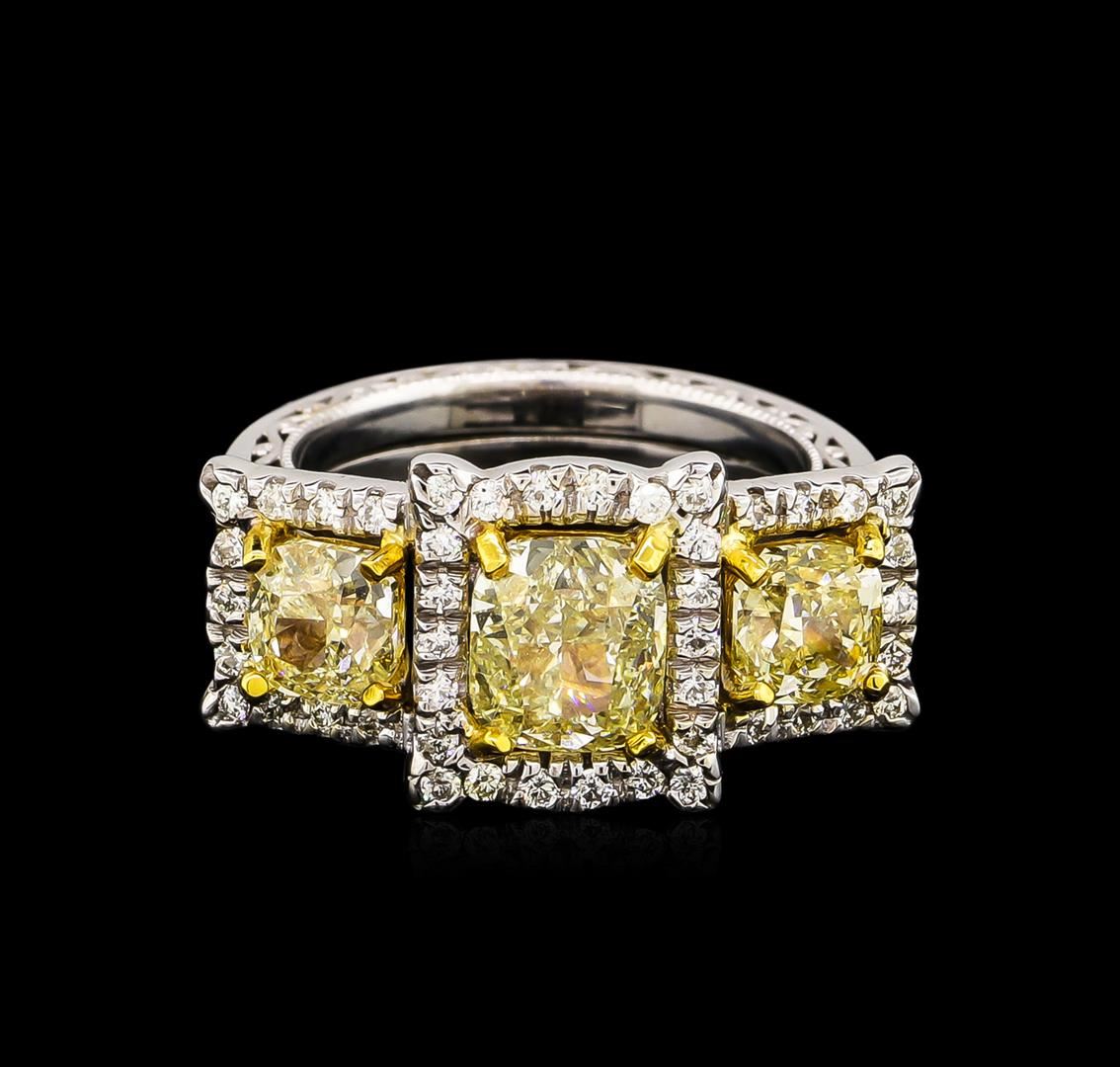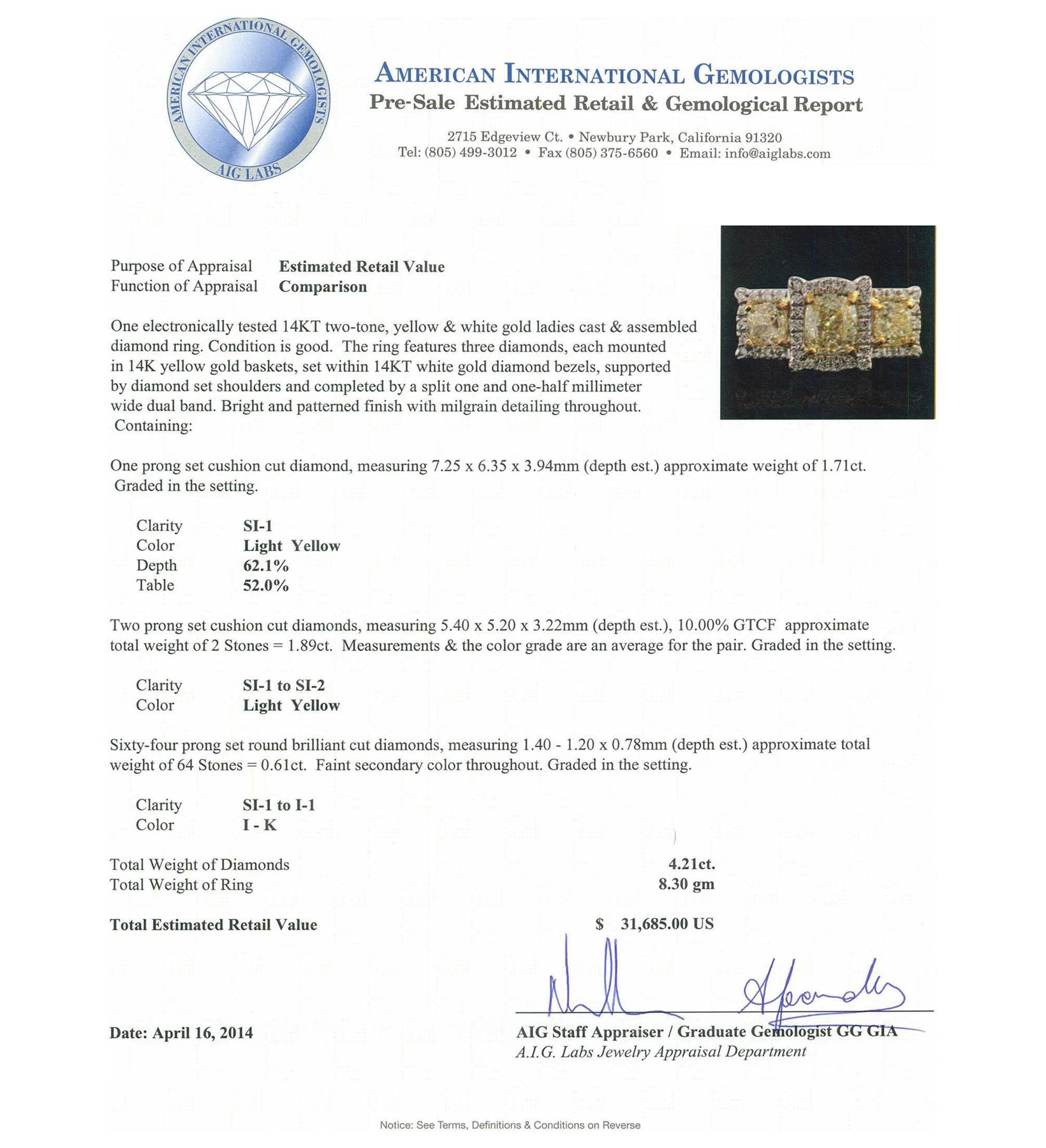 One electronically tested 14KT two-tone, yellow & white gold ladies cast & assembled diamond ring. Condition is good. The ring features three diamonds, each mounted in 14K yellow gold baskets, set within 14KT white gold diamond bezels, supported by diamond set shoulders and completed by a split one and one-half millimeter wide dual band. Bright and patterned finish with milgrain detailing throughout. Containing: One prong set cushion cut diamond, measuring 7.25 x 6.35 x 3.94mm (depth est.) approximate weight of 1.71ct. Graded in the setting. Clarity: SI-1. Depth: 62.1%. Table 52.0%. Two prong set cushion cut diamonds, measuring 5.40 x 5.20 x 3.22mm (depth est.), 10.00.%. GTCF approximate. Total Weight of 2 Stones = 1.89ct. Measurements & the color grade are an average for the pair. Graded in the setting. Clarity: SI-1 to SI-2 Sixty-Four prong set round brilliant cut diamonds, measuring 1.40 - 1.20 x 0.78mm (depth est.) approximate. Total Weight of 64 Stones = 0.61ct. Faint secondary color throughout. Graded in the setting. Clarity: SI-1 to I-1. Color: I - K. Total Weight of Diamonds 4.21ct. Total Weight of Ring 8.30 grams. AIG Appraised at $31,685.00.