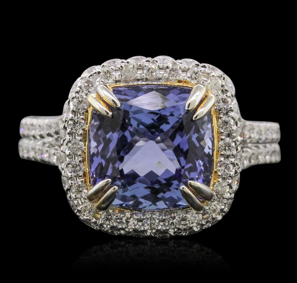 One electronically tested 14KT white and yellow gold ladies combination cast & assembled tanzanite and diamond ring with a split shank with a bright polish finish. Identified with markings of "14K". Condition is new. Containing: One prong set oval square cushion modified brilliant cut natural tanzanite, measuring 9.43 x 9.43 x 6.13mm, approximate weight of 4.29ct., clarity is eye clean, type I, medium light, very slightly grayish, violet color, (GIA V 4/3), cut is good. Ninety-Nine prong set round brilliant cut diamonds, measuring 1.50 - 1.20 x 0.81mm (depth est.) approximate total weight of 99 Stones = 0.89ct. Clarity: SI-2 to I-1. Color: I - J, Cut is Good. Colored gemstones are presumed to have been subjected to commonly used enhancement processes. All diamonds and colored gemstones are graded in the mounting, unless otherwise stated. Total Weight of Colored Stones 4.29ct. Total Weight of Diamonds 0.89ct. Total Weight of Ring 6.10 grams. GGL Appraised at $9,700.00.