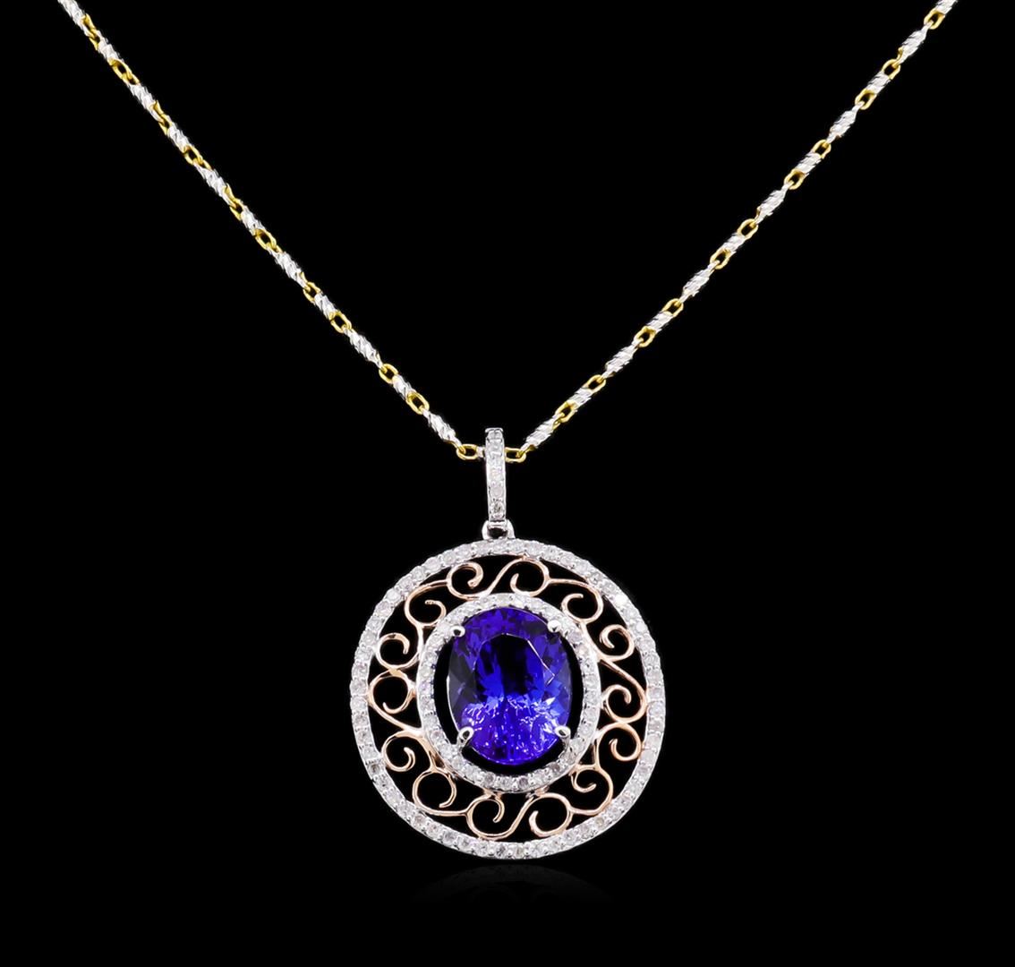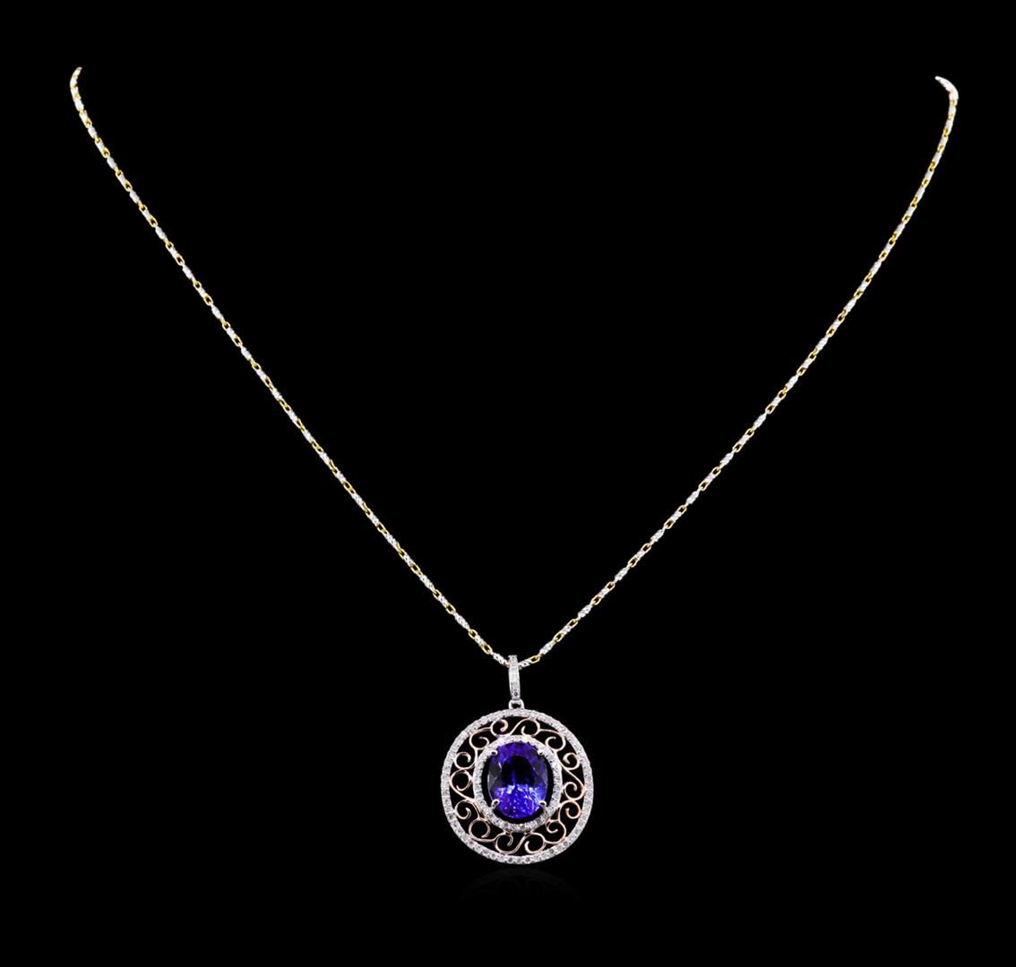 One electronically tested 14KT white and yellow gold Ladies combination cast & die struck pendant & chain 17.0" long, medium fancy cable link with a lobster claw clasp with a bright polish finish. Condition is new. Identified with markings of "14K". Containing: One prong set oval modified mixed cut natural tanzanite, measuring 11.50 x 8.60 x 6.10mm, approximate weight of 4.32ct., clarity is eye clean, type I, medium dark, moderately strong, blue color, (GIA B 6/4), cut is very good. Colored gemstones are presumed to have been subjected to commonly used and possible undetectable color/clarity enhancement processes. Ninety-Nine bead set round brilliant cut diamonds, measuring 1.10 - 1.10 x 0.66mm (depth est.) approximate. Total Weight of 99 Stones = 0.55ct. Clarity: I-2 to I-3. Color: H - I, Cut is Good. Total Weight of Colored Stones 4.32ct. Total Weight of Diamonds 0.55ct. Total Weight of Pendant & Chain 7.20gm. GGL Appraised at $9,795.00.