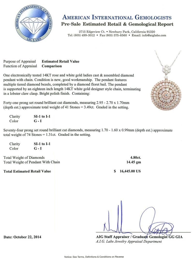 One electronically tested 14KT rose and white gold ladies cast & assembled diamond pendant with chain. The pendant features multiple tiered diamond bezels, completed by a diamond floret bail. The pendant is supported by an eighteen inch length 14KT white gold designer style chain, terminating in a lobster claw clasp. Bright polish finish. Condition is new, good workmanship. Containing: Forty-One prong set round brilliant cut diamonds, measuring 2.95 - 2.70 x 1.70mm (depth est.) approximate total weight of 41 Stones = 3.49ct. Graded in the setting. Clarity: SI-1 to I-1. Color: G - I Seventy-Four prong set round brilliant cut diamonds, measuring 1.70 - 1.60 x 0.99mm (depth est.) approximate total weight of 74 Stones = 1.31ct. Graded in the setting. Clarity: SI-1 to I-1. Color: G - I. Total Weight of Diamonds 4.80 ct. Total Weight of Pendant With Chain 14.45 grams. AIG Appraised.