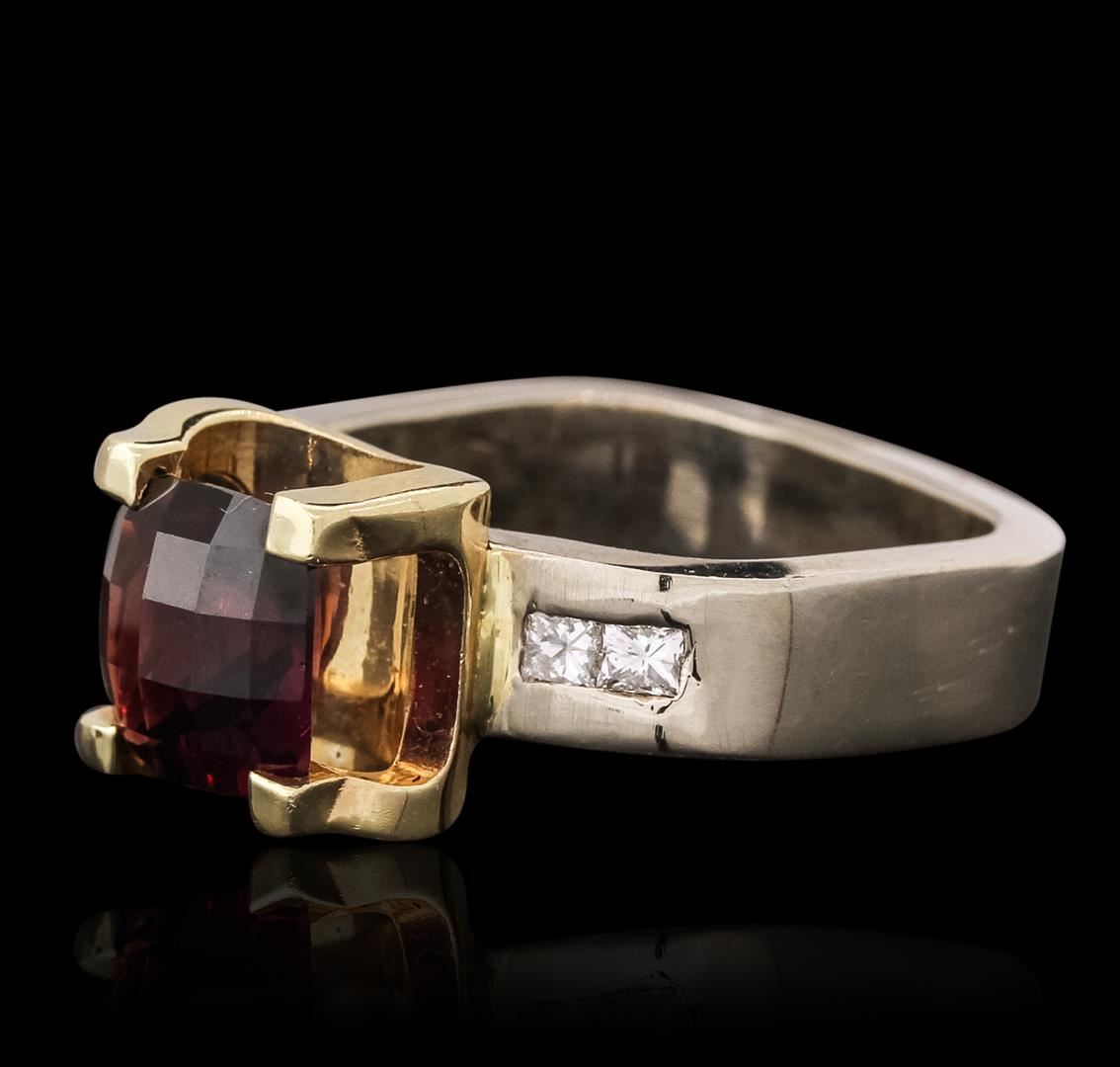 One electronically tested 14KT white and yellow gold ladies combination cast & assembled ring with a bright polish finish. Identified with markings of "14K". Condition is very good. Containing: One prong set square modified mixed cut natural almandite garnet, measuring 9.09 x 9.00 x 5.88mm, approximate weight of 4.87ct., clarity is eye clean, type II, medium, moderately strong, reddish purple color, (GIA rP 5/4), cut is very good. Four channel set princess cut diamonds, measuring 2.00 x 2.00 x 1.50mm (depth est.) approximate total weight of 4 Stones = 0.20ct. Clarity: VS-2 to SI-1. Color: I - J, Cut is Good. Colored gemstones are presumed to have been subjected to commonly used enhancement processes. All diamonds and colored gemstones are graded in the mounting, unless otherwise stated. Total Weight of Colored Stones 4.87ct. Total Weight of Diamonds 0.20ct. Total Weight of Ring 15.20 grams. GGL Appraised at $6,765.00.