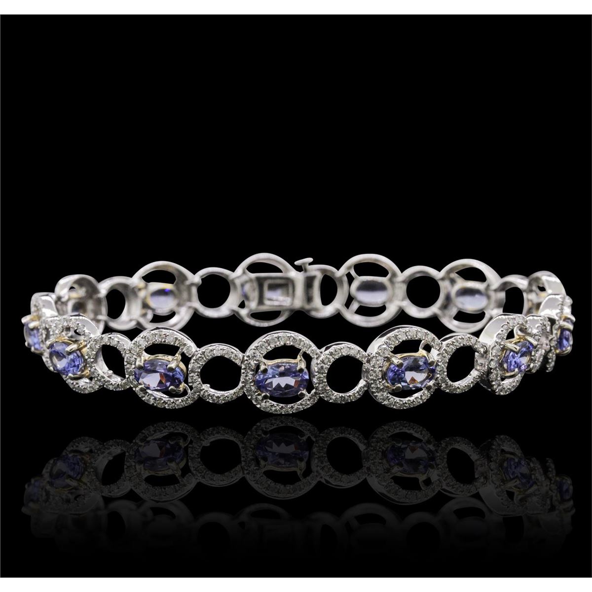 One electronically tested 14KT white and yellow gold ladies combination cast & assembled tanzanite and diamond bracelet with a hidden box clasp with a bright polish finish. Measurements: 7.25" in length. Condition is new. Containing: Thirteen prong set oval modified brilliant cut natural tanzanites, measuring 6.13 x 3.86 x 2.36mm, approximate total weight of 5.07ct., clarity is eye clean, type I, medium light, very slightly grayish, violet color, (GIA V 4/3), cut is very good. Five Hundred Twenty prong set round brilliant cut diamonds, measuring 1.00 - 1.00 x 0.60mm (depth est.) approximate total weight of 520 Stones = 1.87ct. Clarity: I-1 to I-2. Color: I - J, Cut is Good. Colored gemstones are presumed to have been subjected to commonly used enhancement processes. All diamonds and colored gemstones are graded in the mounting, unless otherwise stated. Total Weight of Colored Stones 5.07ct. Total Weight of Diamonds 1.87ct. Total Weight of Bracelet 15.60 grams. GGL Appraised at $12,580.00.