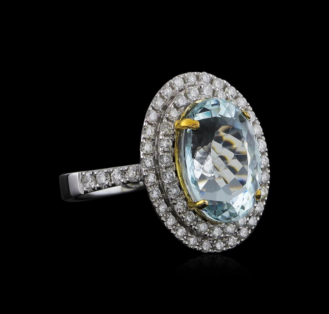 One electronically tested 14KT white and yellow gold ladies combination cast & assembled aquamarine and diamond ring with a flat shank with a bright polish finish. Identified with markings of "14K". Condition is new. Containing: One prong set oval modified brilliant cut natural aquamarine, measuring 13.39 x 9.70 x 7.07mm, approximate weight of 5.13ct., clarity is eye clean, type I, light, very slightly grayish, blue color, (GIA B 3/3), cut is very good. Sixty-Two prong set round brilliant cut diamonds, measuring 2.00 - 1.30 x 0.99mm (depth est.) approximate total weight of 62 Stones = 0.75ct. Clarity: SI-2 to I-1. Color: I - J, Cut is Good. Colored gemstones are presumed to have been subjected to commonly used enhancement processes. All diamonds and colored gemstones are graded in the mounting, unless otherwise stated. Total Weight of Colored Stones 5.13ct. Total Weight of Diamonds 0.75ct. Total Weight of Ring 6.90 grams. GGL Appraised at $7,300.00.