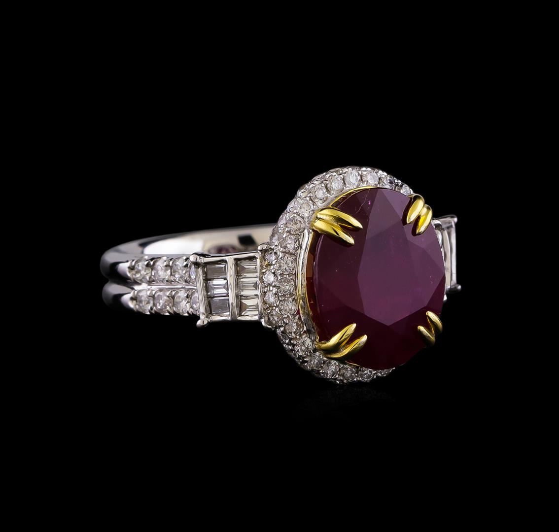 One electronically tested 14KT white and yellow gold ladies combination cast & assembled ruby and diamond ring with a split shank with a bright polish finish. Identified with markings of "14K". Condition is new. Containing: One prong set oval modified brilliant cut natural ruby, measuring 11.90 x 9.60 x 5.95mm, approximate weight of 5.44ct., clarity is heavily included, medium, moderately strong, purple red color, (GIA PR 5/4), cut is good. One Hundred Twenty-Nine prong set round brilliant cut diamonds, measuring 1.50 - 1.10 x 0.78mm (depth est.) approximate total weight of 129 Stones = 1.03ct. Clarity: SI-2 to I-2. Color: I - J, Cut is Good. Twelve channel set baguette cut diamonds, measuring 1.50 x 1.30 x 1.11mm (depth est.) approximate total weight of 12 Stones = 0.24ct. Clarity: SI-1. Color: J, Cut is Good. Colored gemstones are presumed to have been subjected to commonly used enhancement processes. All diamonds and colored gemstones are graded in the mounting, unless otherwise stated. Total Weight of Colored Stones 5.44ct. Total Weight of Diamonds 1.27ct. Total Weight of Ring 7.80 grams. GGL Appraised at $6,875.00.