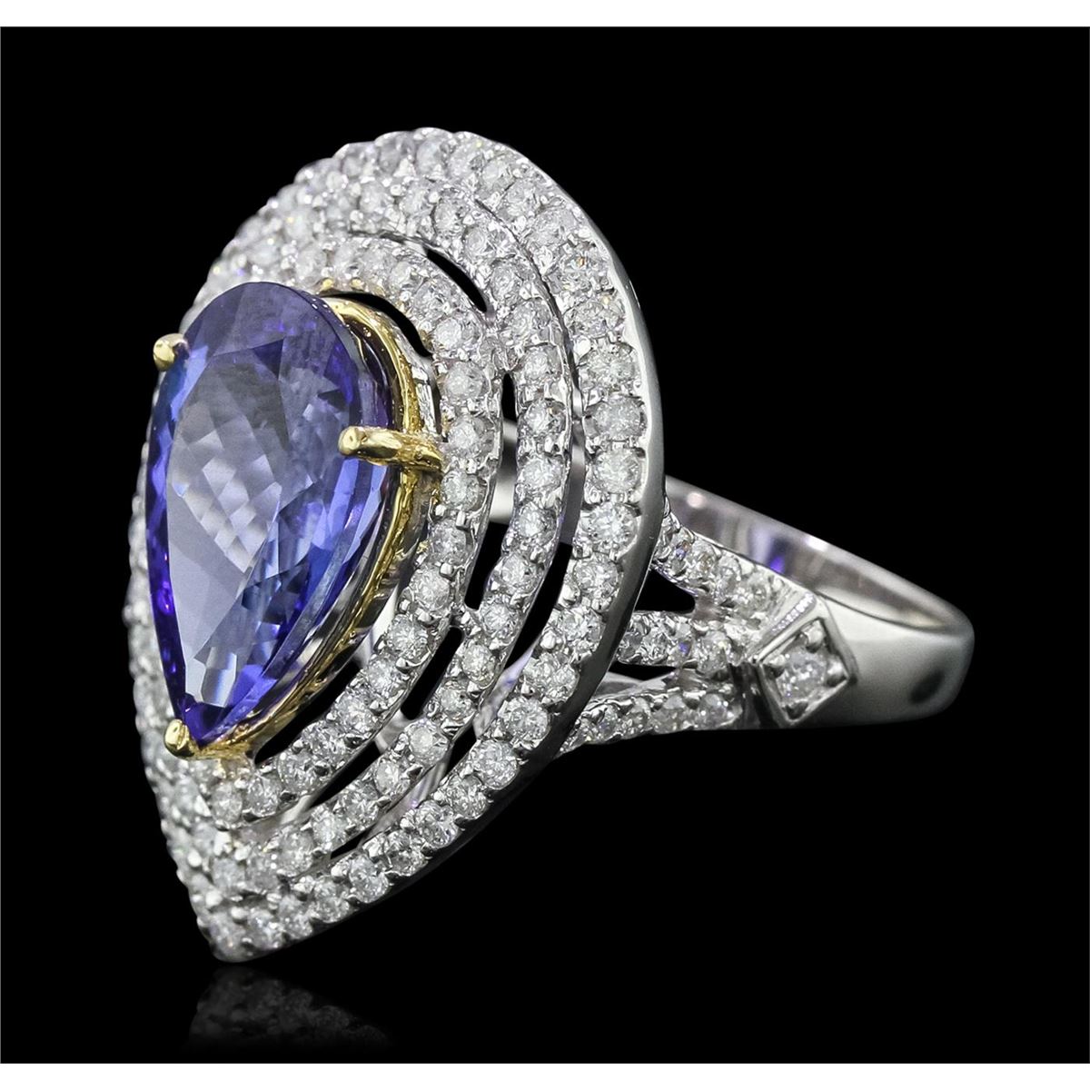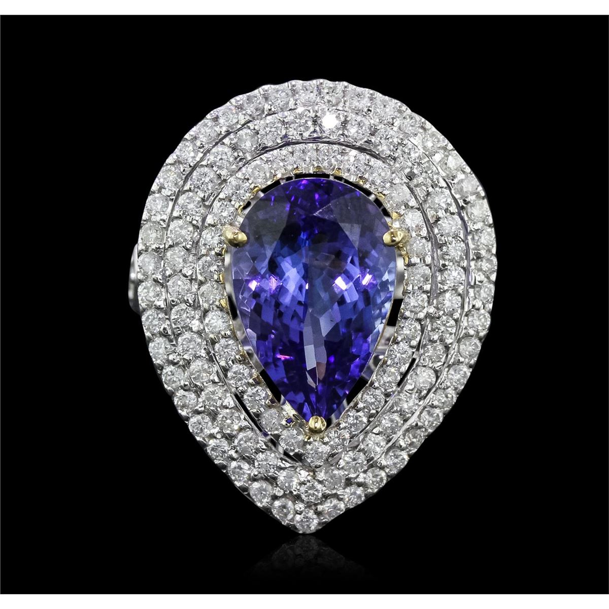 One electronically tested 14KT white and yellow gold Ladies combination cast & assembled ring with a bright polish finish. Condition is new. Identified with markings of "14K". Containing: One prong set oval pear modified brilliant cut natural tanzanite, measuring 14.00 x 9.00 x 6.48mm, approximate weight of 5.47ct., clarity is eye clean, type I, medium, moderately strong, violetish blue color, (GIA vB 5/4), cut is good. Colored gemstones are presumed to have been subjected to commonly used color/clarity enhancement processes. One Hundred Forty prong set round brilliant cut diamonds, measuring 1.40 - 1.40 x 0.84mm (depth est.) approximate. Total Weight of 140 Stones = 1.40ct. Clarity: I-1 to I-2. Color: H - I, Cut is Good. Total Weight of Colored Stones 5.47ct. Total Weight of Diamonds 1.40ct. Total Weight of Ring 7.30 grams. GGL Appraised at $12,400.00.