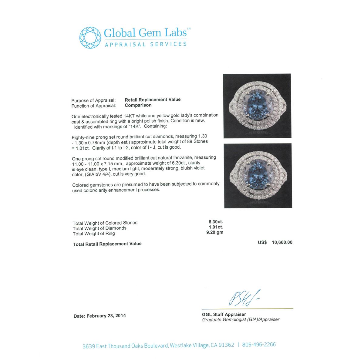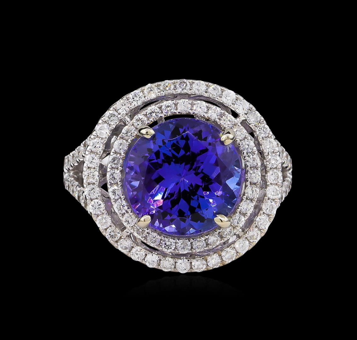 One electronically tested 14KT white and yellow gold Ladies combination cast & assembled ring with a bright polish finish. Condition is new. Identified with markings of "14K". Containing: Eighty-Nine prong set round brilliant cut diamonds, measuring 1.30 - 1.30 x 0.78mm (depth est.) approximate. Total Weight of 89 Stones = 1.01ct. Clarity: I-1 to I-2. Color: I - J, Cut is Good. One prong set round modified brilliant cut natural tanzanite, measuring 11.00 - 11.00 x 7.15 mm, approximate weight of 6.30ct., clarity is eye clean, type I, medium light, moderately strong, bluish violet color, (GIA bV 4/4), cut is very good. Colored gemstones are presumed to have been subjected to commonly used color/clarity enhancement processes. Total Weight of Colored Stones 6.30ct. Total Weight of Diamonds 1.01ct. Total Weight of Ring 9.20 grams. GGL Appraised at $10,660.00.