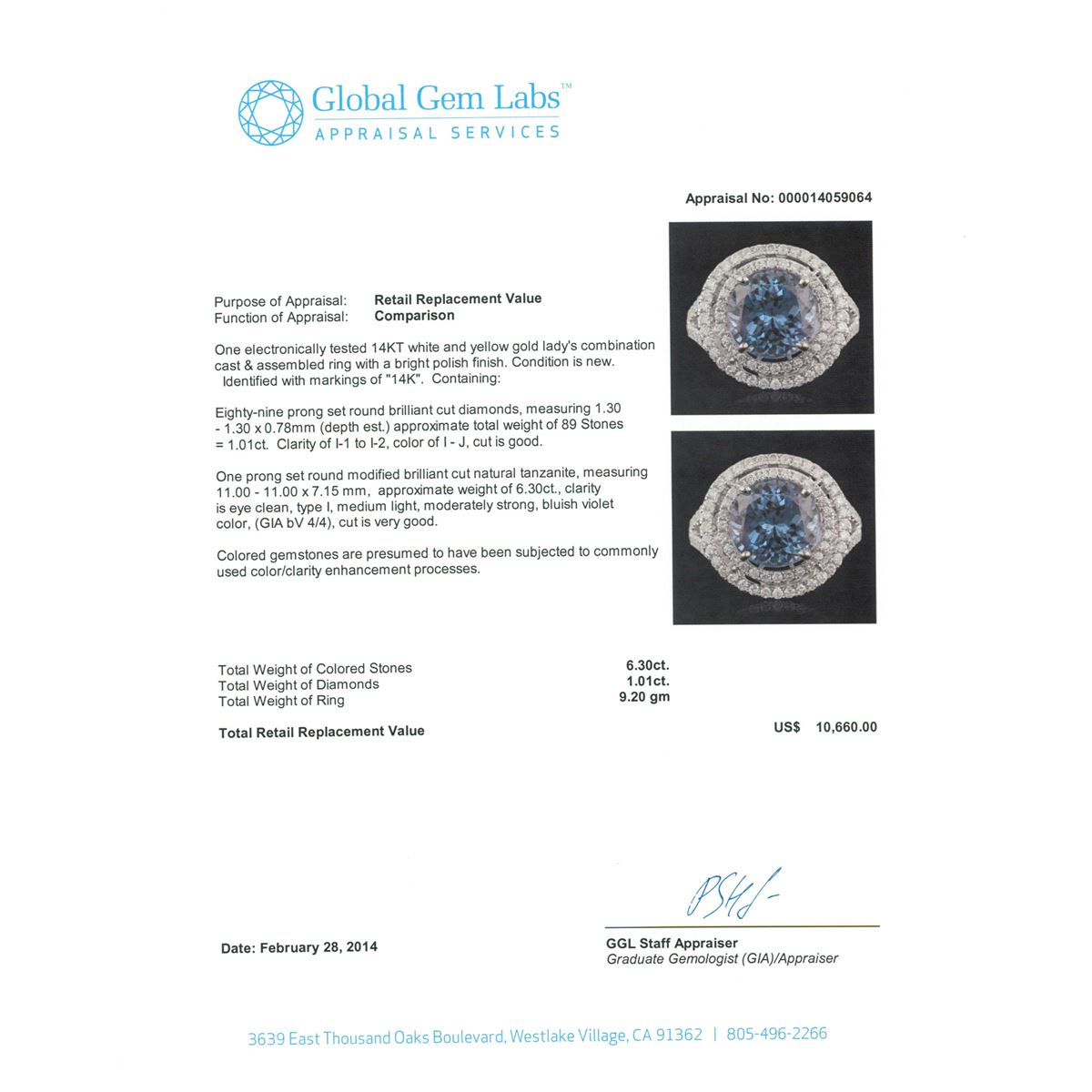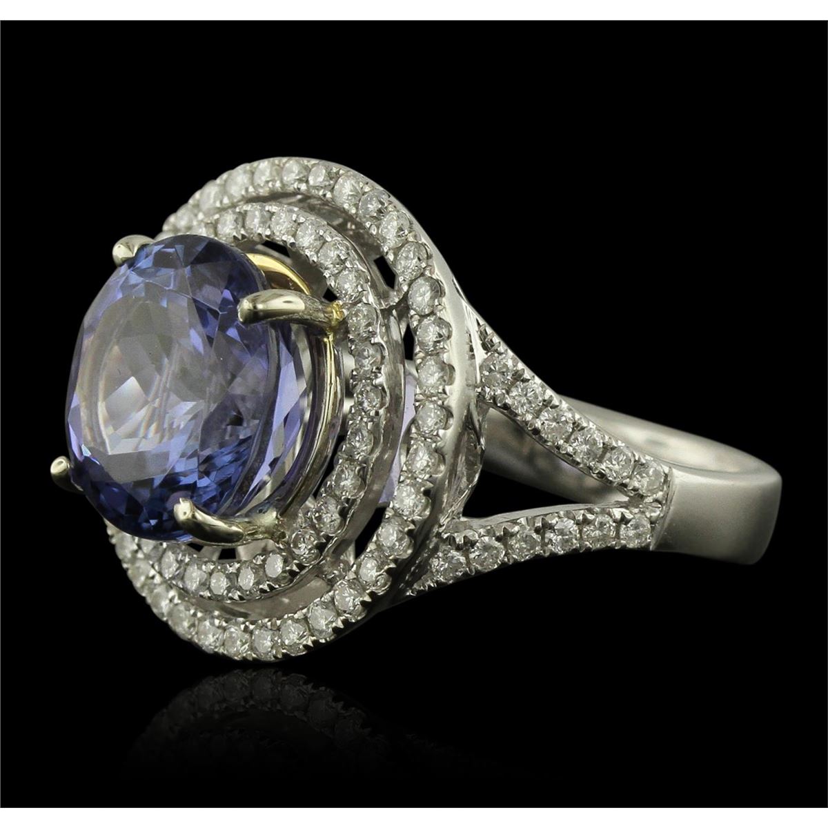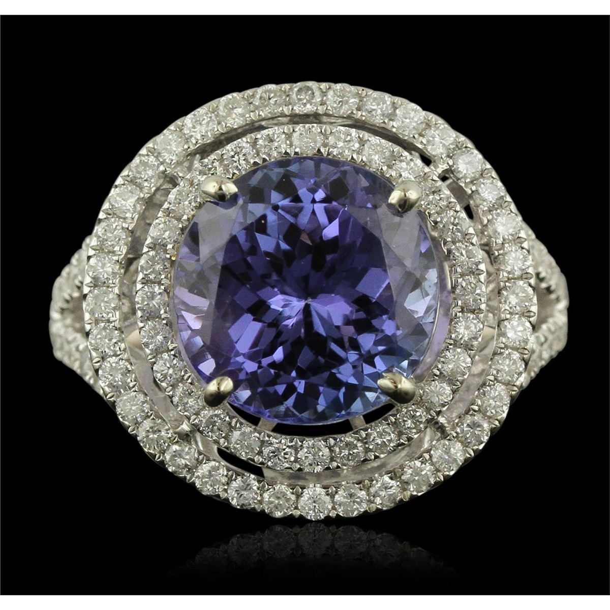 One electronically tested 14KT white and yellow gold Ladies combination cast & assembled ring with a bright polish finish. Condition is new. Identified with markings of "14K". Containing: Eighty-Nine prong set round brilliant cut diamonds, measuring 1.30 - 1.30 x 0.78mm (depth est.) approximate. Total Weight of 89 Stones = 1.01ct. Clarity: I-1 to I-2. Color: I - J, Cut is Good. One prong set round modified brilliant cut natural tanzanite, measuring 11.00 - 11.00 x 7.15 mm, approximate weight of 6.30ct., clarity is eye clean, type I, medium light, moderately strong, bluish violet color, (GIA bV 4/4), cut is very good. Colored gemstones are presumed to have been subjected to commonly used color/clarity enhancement processes. Total Weight of Colored Stones 6.30ct. Total Weight of Diamonds 1.01ct. Total Weight of Ring 9.20 grams. GGL Appraised at $10,660.00.