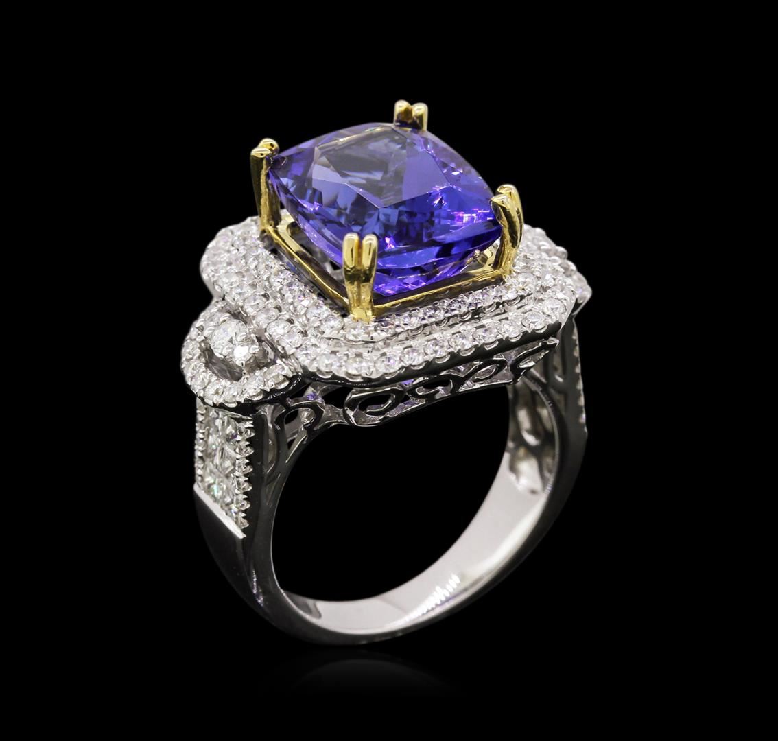 One electronically tested 14KT white and yellow gold Ladies combination cast & assembled fashion ring with a bright polish finish. Condition is new. Identified with markings of "14K". Containing: One prong set rectangular cushion modified brilliant cut natural tanzanite, measuring 12.20 x 9.90 x 7.50mm, approximate weight of 7.46ct., clarity is eye clean, type I, medium light, moderately strong, bluish violet color, (GIA bV 4/4), cut is good. Colored gemstones are presumed to have been subjected to commonly used and possible undetectable color/clarity enhancement processes. Ninety-Eight prong set round brilliant cut diamonds, measuring 1.10 - 1.10 x 0.66mm (depth est.) approximate. Total Weight of 98 Stones = 0.80ct. Clarity: SI-2 to I-1. Color: G, Cut is Good. Two prong set round brilliant cut diamonds, measuring 2.20 - 2.20 x 1.32mm (depth est.) approximate. Total Weight of 2 Stones = 0.08ct. Clarity: SI-1 to SI-2. Color: H - I, Cut is Good. Twelve invisible set princess cut diamonds, measuring 2.00 x 2.00 x 1.50mm (depth est.) approximate. Total Weight of 12 Stones = 0.89ct. Clarity: SI-1 to SI-2. Color: H - I, Cut is Good. Total Weight of Colored Stones 7.46ct. Total Weight of Diamonds 1.77ct. Total Weight of Ring 10.40 grams. GGL Appraised at $15,675.00.