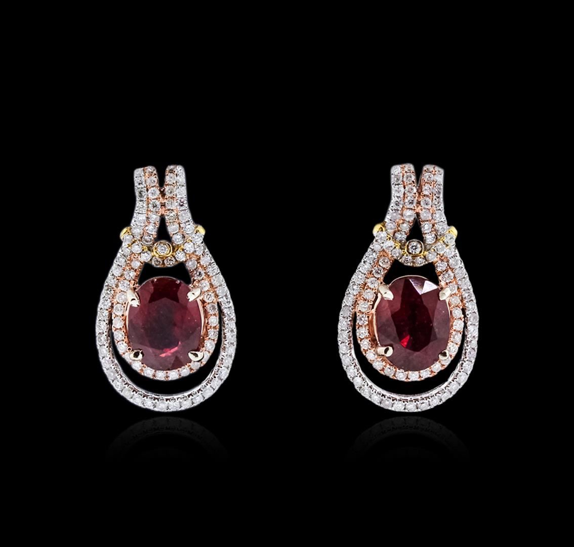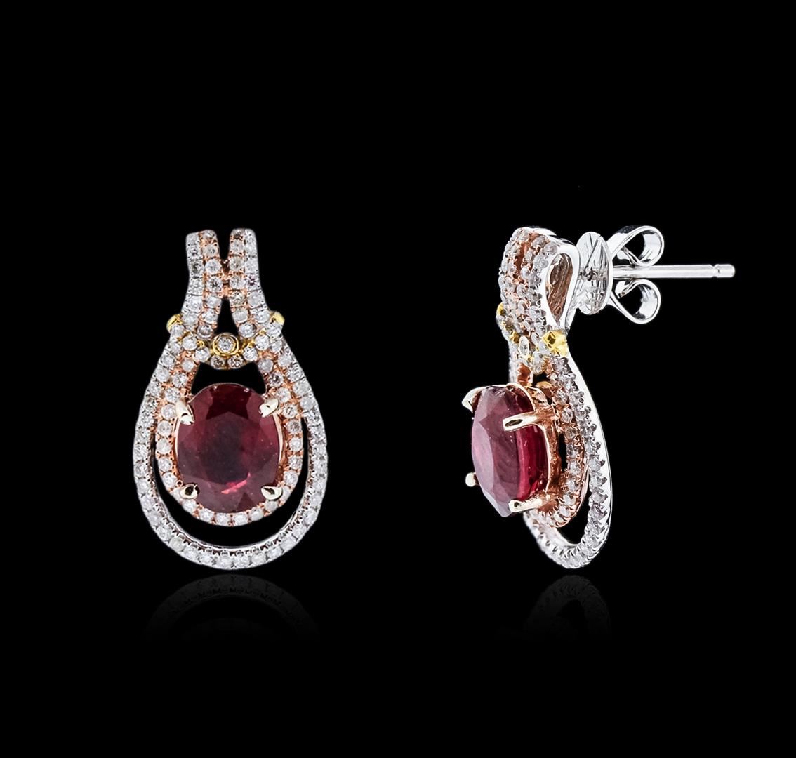 One pair electronically tested 14KT white and rose gold ladies cast ruby and diamond earrings with friction posts with a bright polish finish. Identified with markings of "14K". Condition is new. Containing: Two prong set oval modified brilliant cut natural rubies, measuring 7.90 x 6.00 x 3.90mm, approximate total weight of 3.10ct., clarity is heavily included, type II, medium dark, very slightly brownish, slightly purplish red color, (GIA slpR 6/3), cut is good. One Hundred Eighty-Six prong set round brilliant cut diamonds, measuring 1.50 - 1.50 x 0.90mm (depth est.) approximate total weight of 186 Stones = 2.29ct. Clarity: SI-1 to SI-2. Color: J - K. Colored gemstones are presumed to have been subjected to commonly used enhancement processes. All diamonds and colored gemstones are graded in the mounting, unless otherwise stated. Total Weight of Colored Stones 3.10ct. Total Weight of Diamonds 2.29ct. Total Weight of Earrings 5.00 grams. GGL Appraised at $4,665.00.