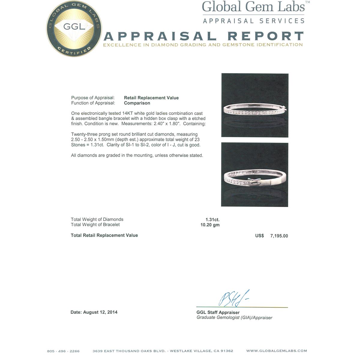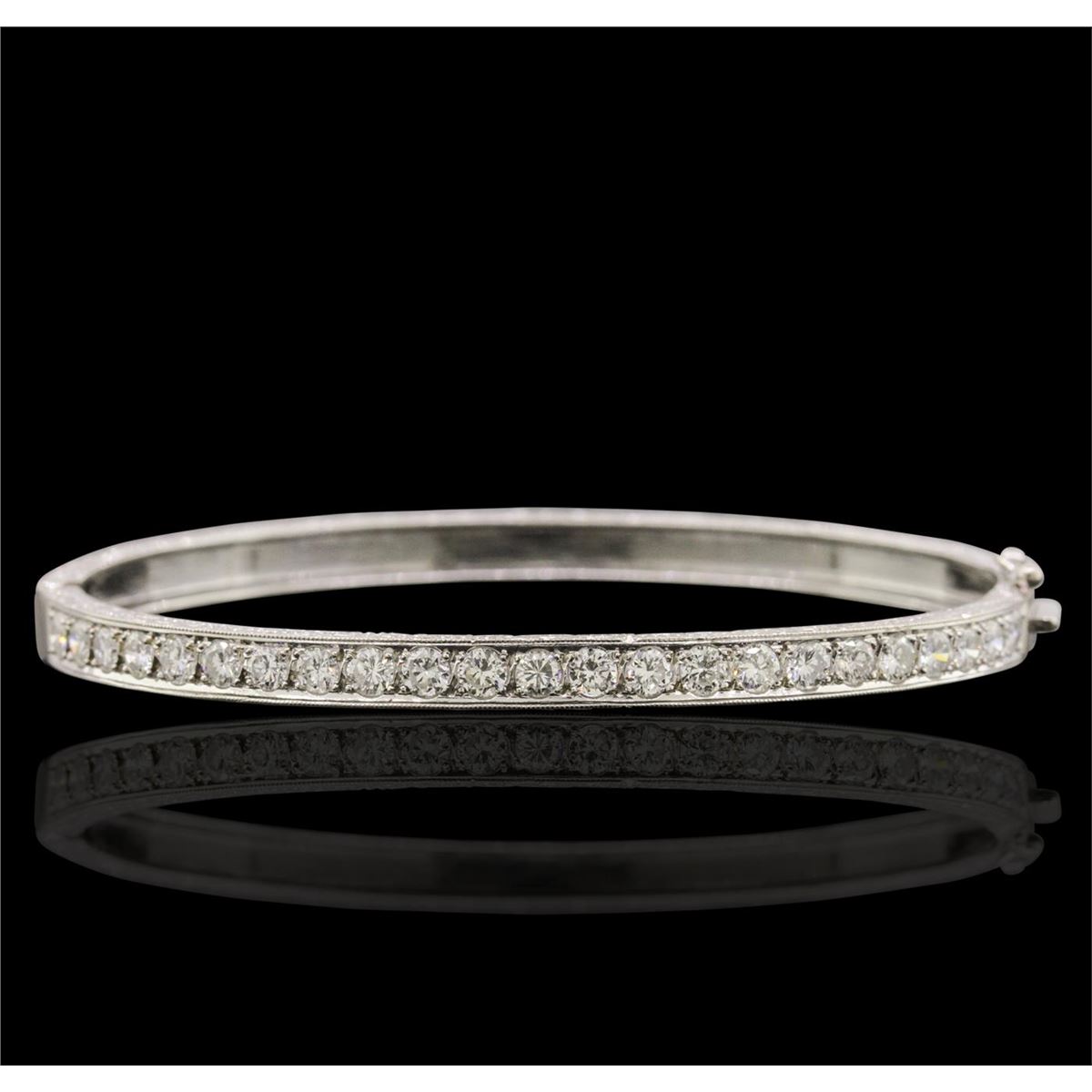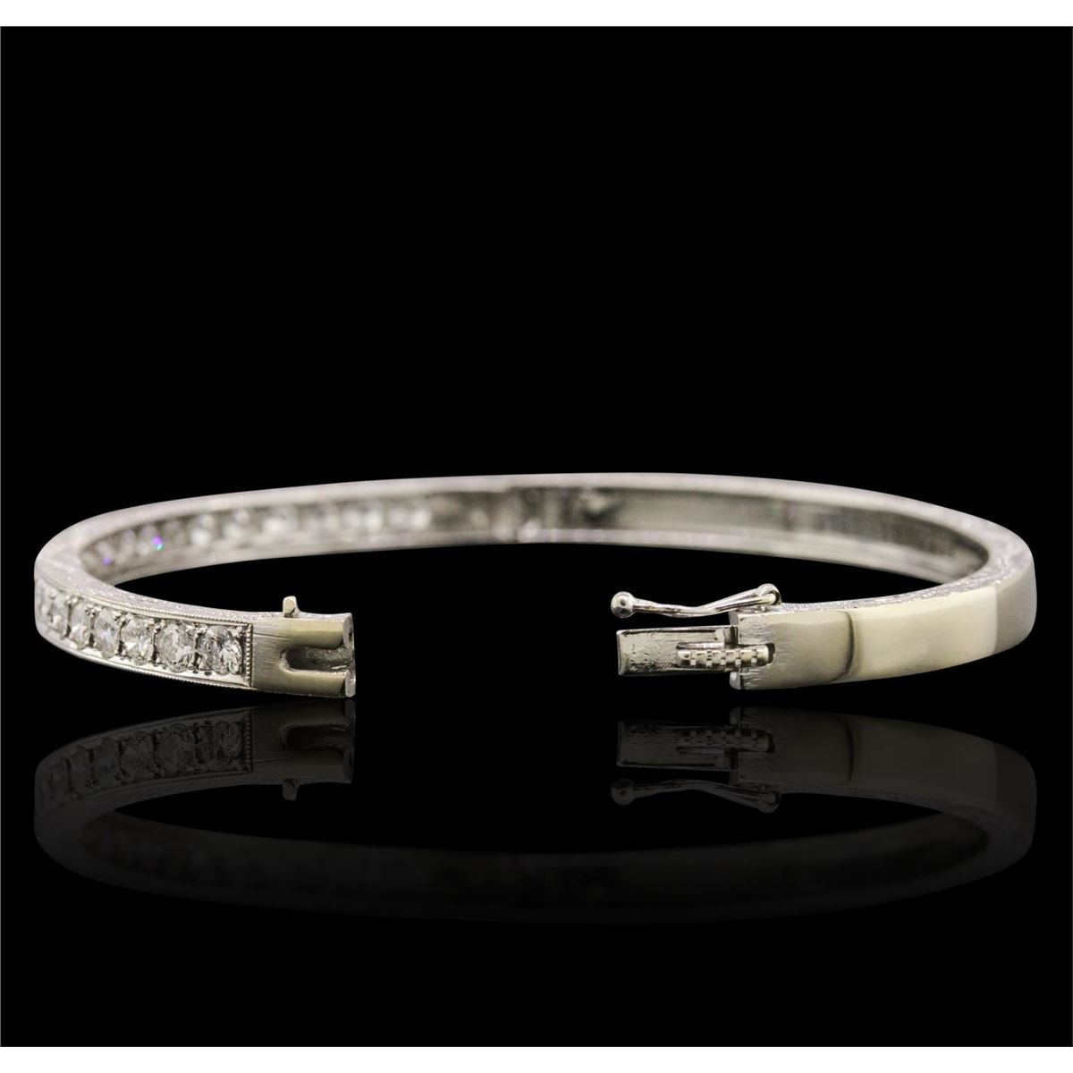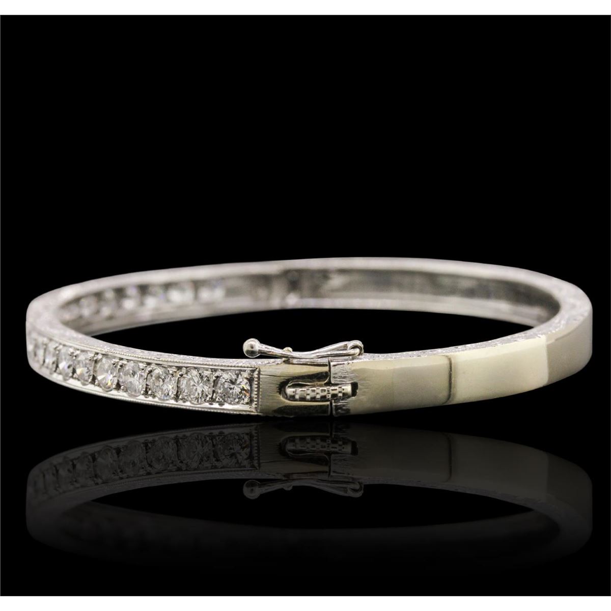 One electronically tested 14KT white gold ladies combination cast & assembled bangle bracelet with a hidden box clasp with a etched finish. Condition is new. Measurements: 2.40" x 1.80". Containing: Twenty-Three prong set round brilliant cut diamonds, measuring 2.50 - 2.50 x 1.50mm (depth est.) approximate. Total Weight of 23 Stones = 1.31ct. Clarity: SI-1 to SI-2. Color: I - J, Cut is Good. All diamonds are graded in the mounting, unless otherwise stated. Total Weight of Diamonds 1.31ct. Total Weight of Bracelet 10.20 grams. GGL Appraised at $7,195.00.