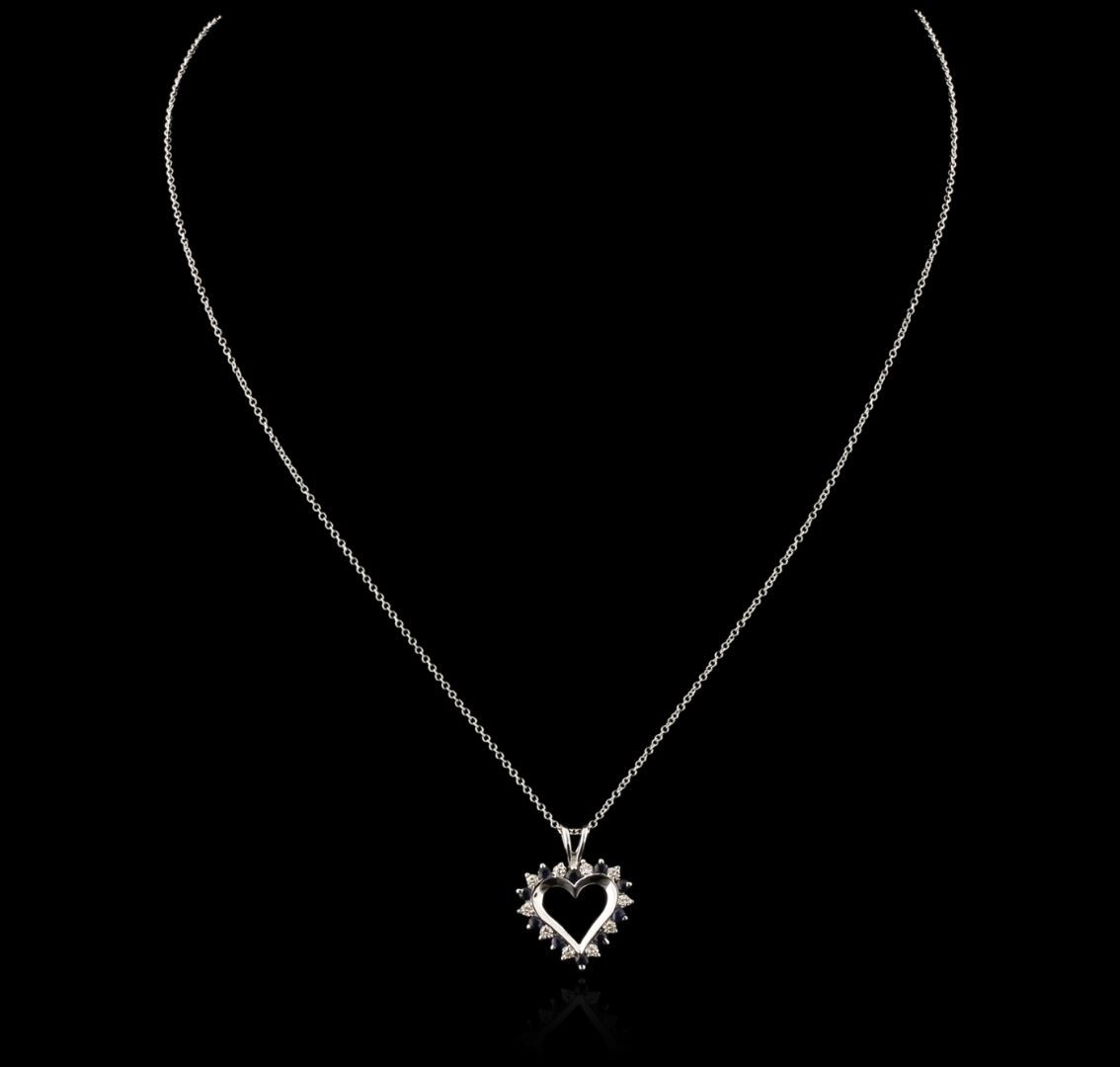 One heart pendant with chain featuring: 14KT white gold weighing 2.82 grams containing blue sapphires with a total weight of 0.10ct and prong set round diamonds with a total weight of 0.10ct.