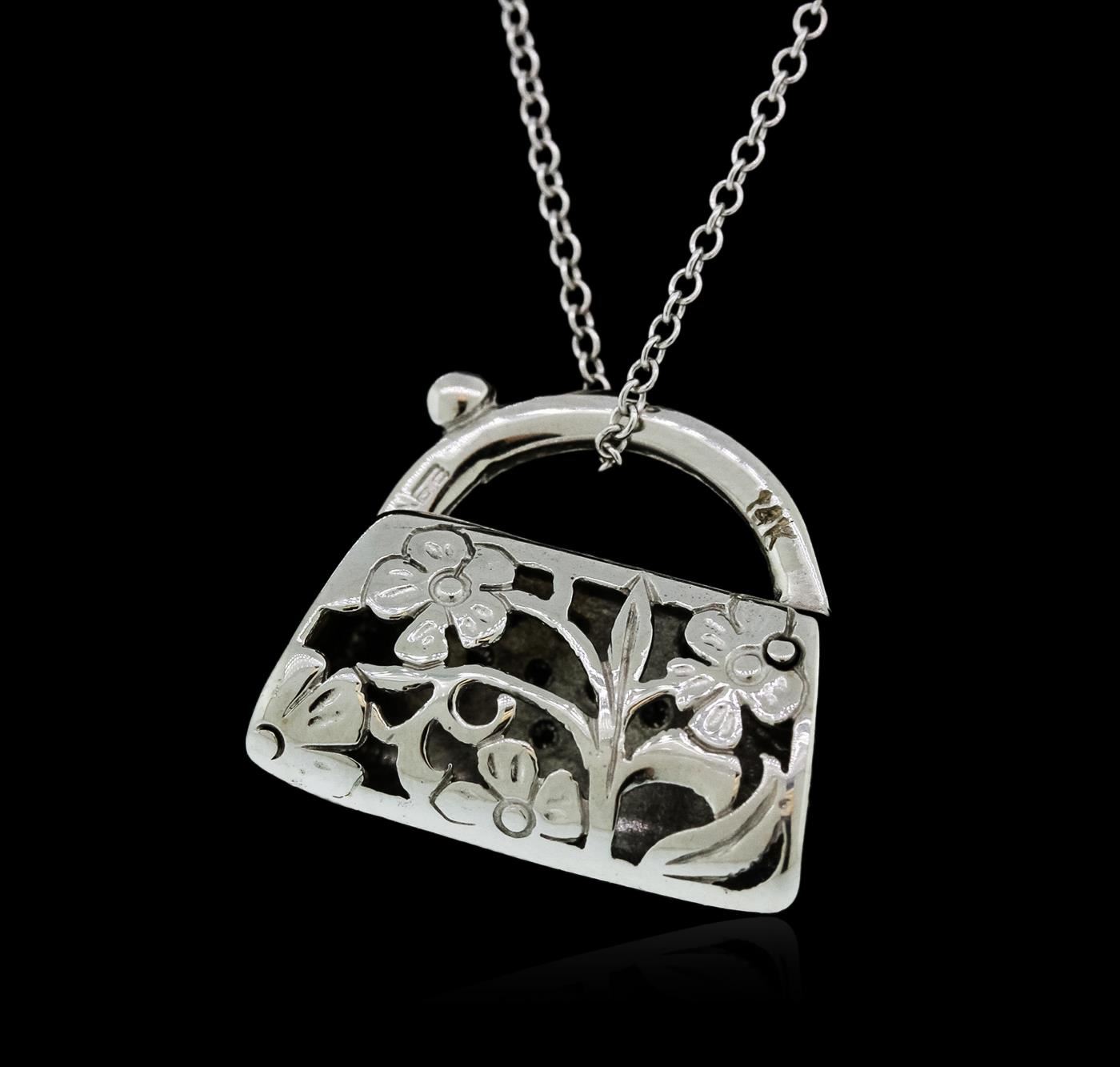 One purse pendant with chain featuring: 14KT white gold weighing 4.20 grams containing pave set round diamonds with a total weight of 0.13ct.