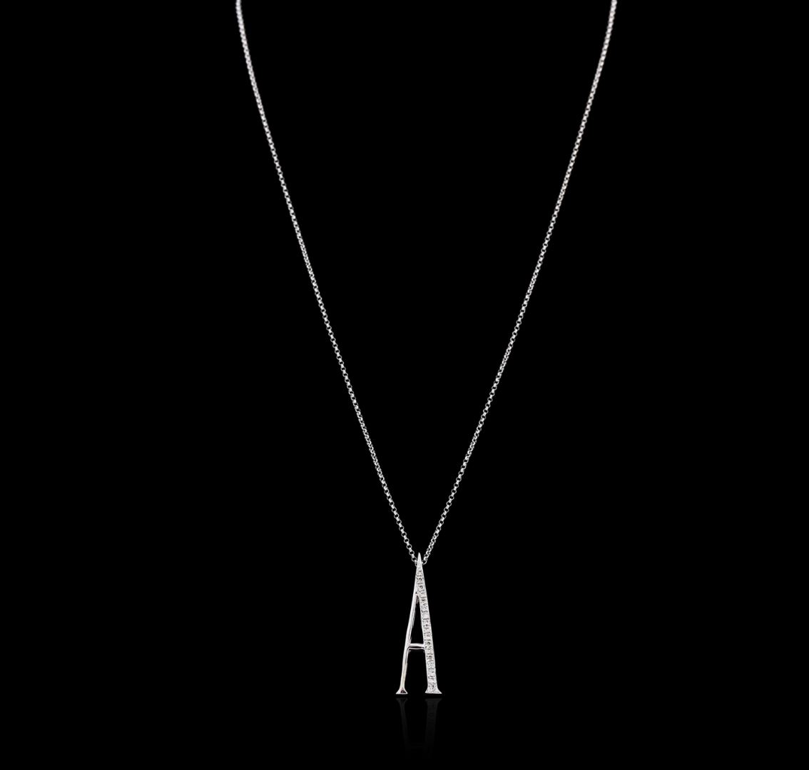 One pendant with chain resembling the letter A featuring: 14KT white gold weighing 3.50 grams containing diamonds with a total weight of 0.13ct.