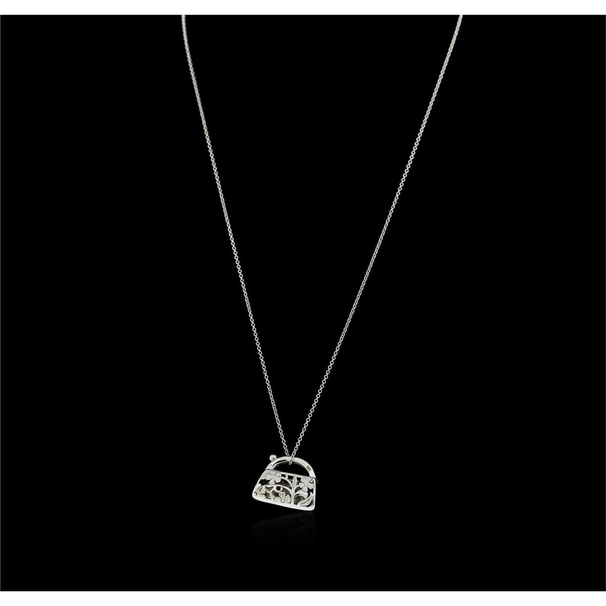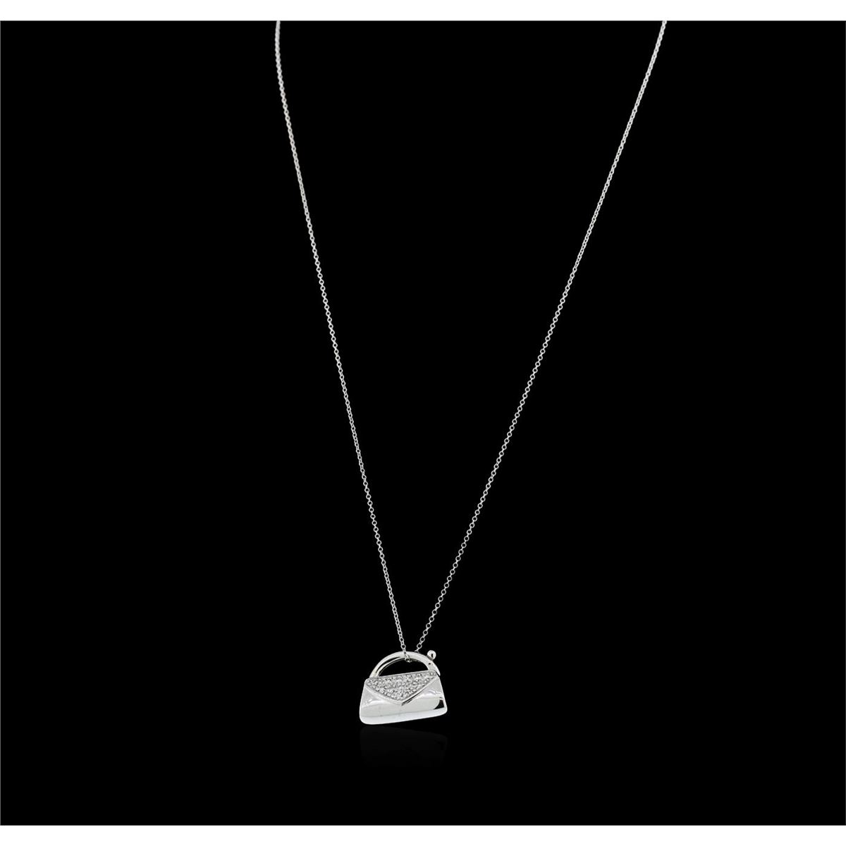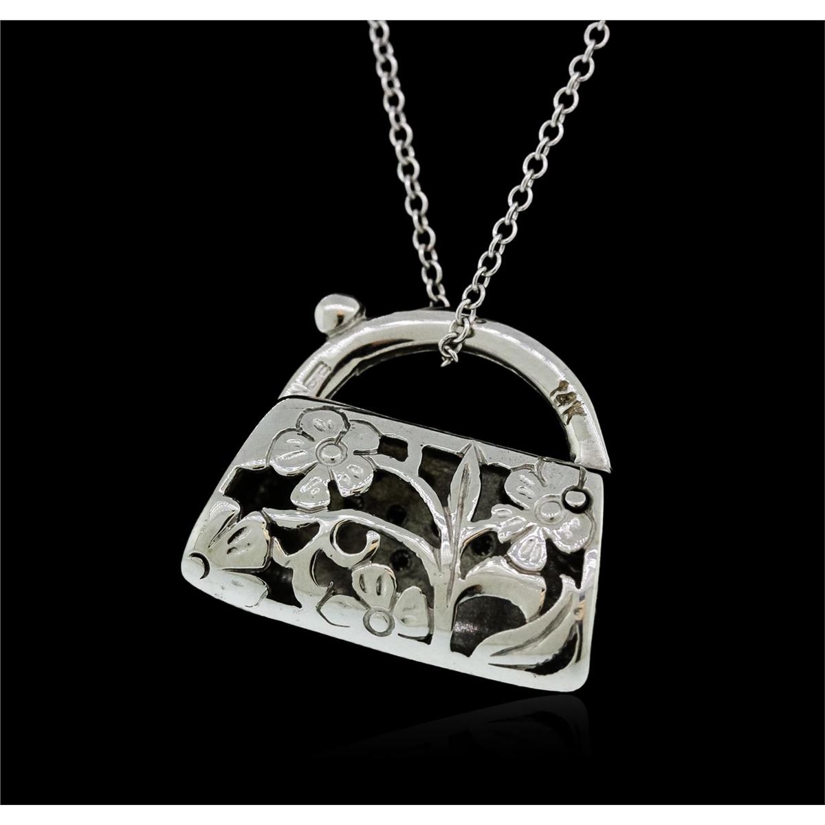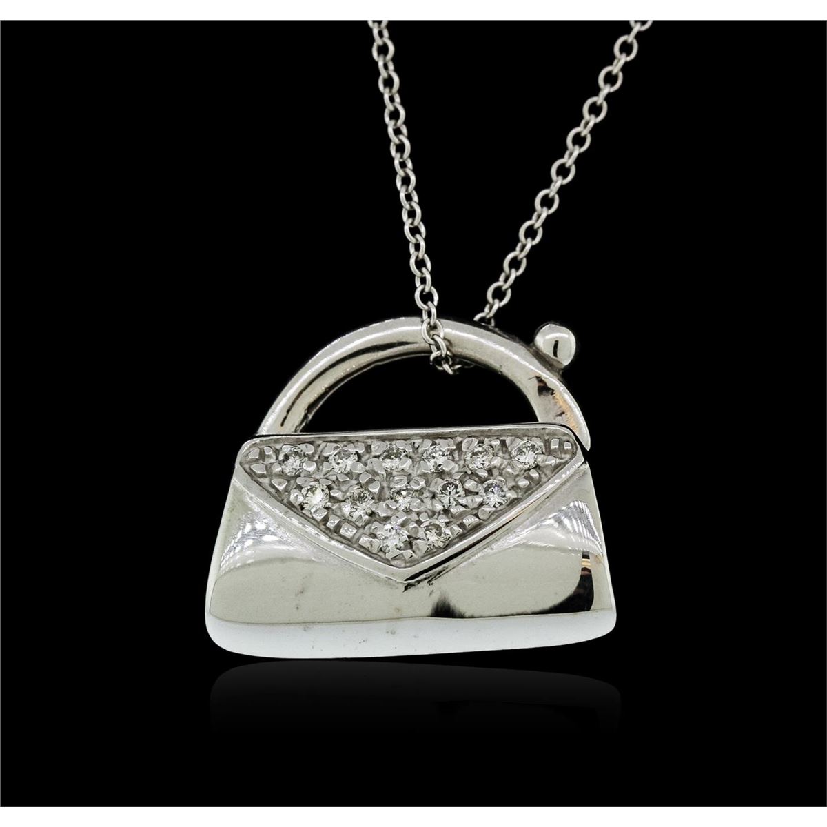One purse pendant with chain featuring: 14KT white gold weighing 4.20 grams containing pave set round diamonds with a total weight of 0.13ct.