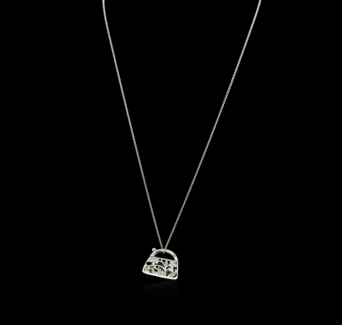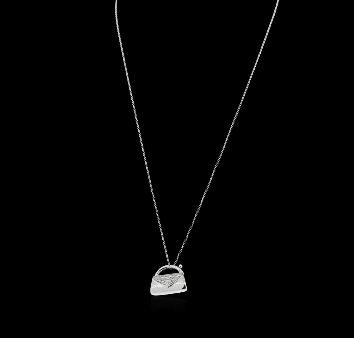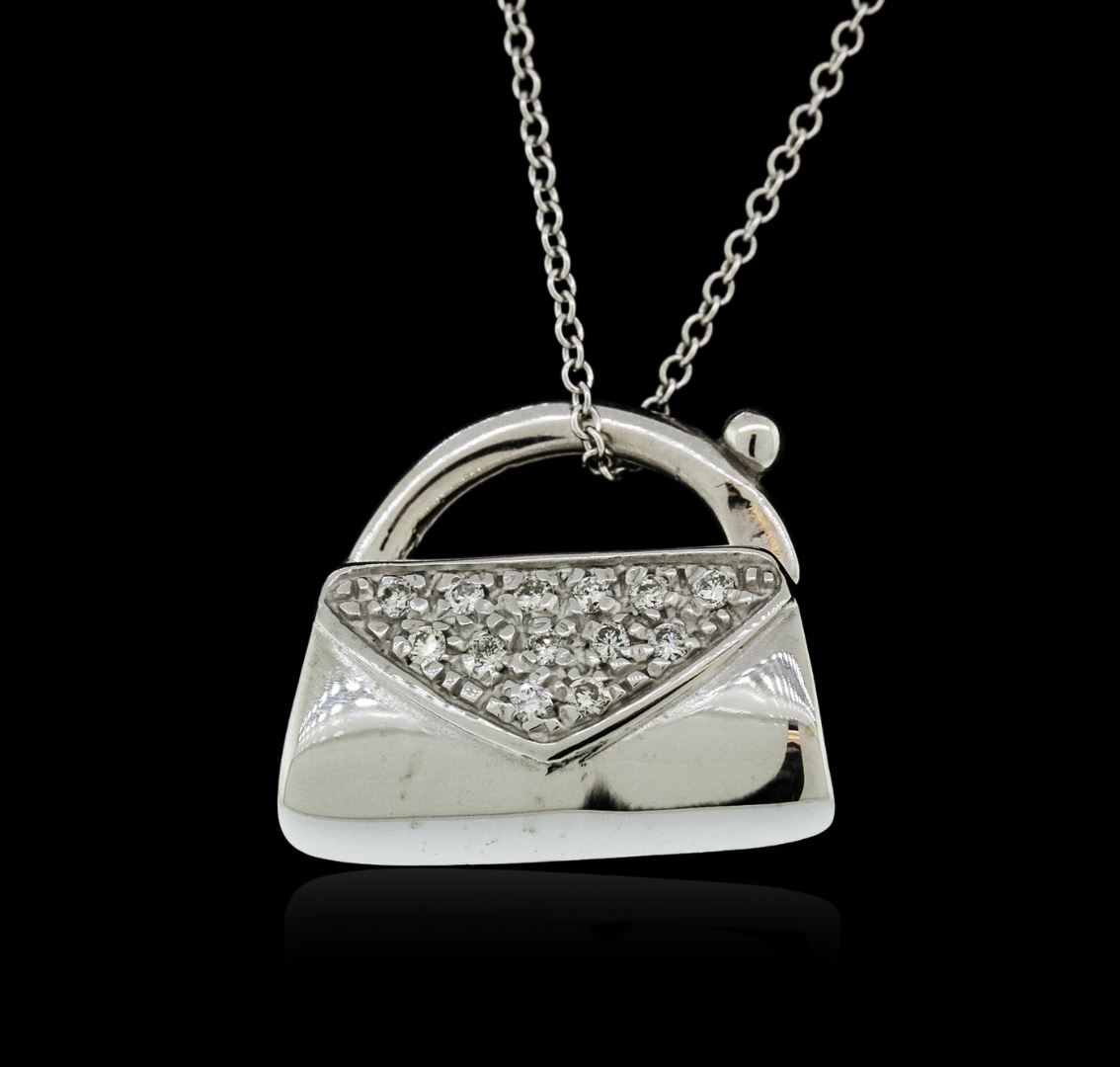 One purse pendant with chain featuring: 14KT white gold weighing 4.20 grams containing pave set round diamonds with a total weight of 0.13ct.