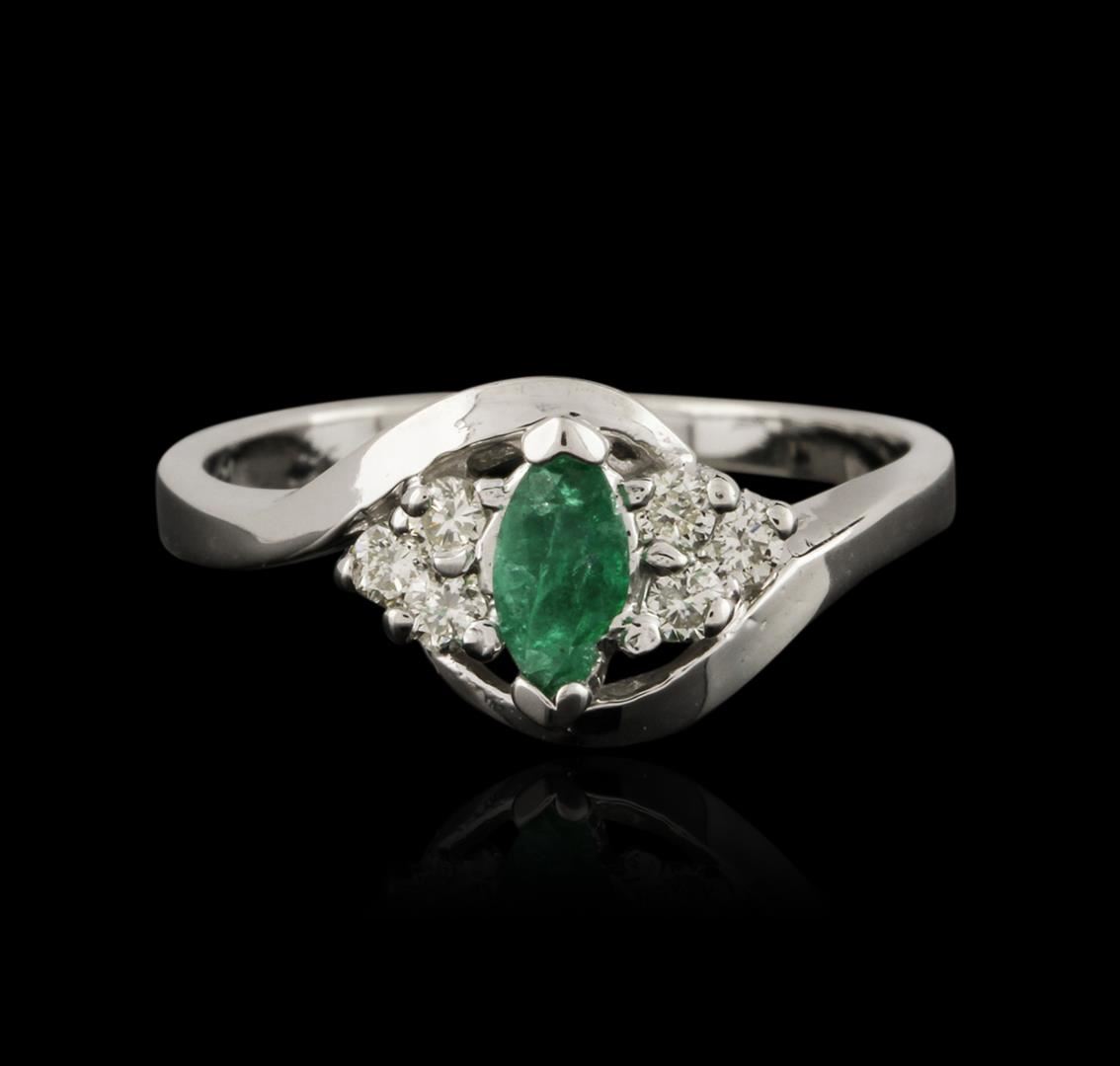 One ring featuring: 14KT white gold weighing 3.12 grams containing one emerald center stone with a total weight of 0.25ct and prong set round diamonds with a total weight of 0.47ct.