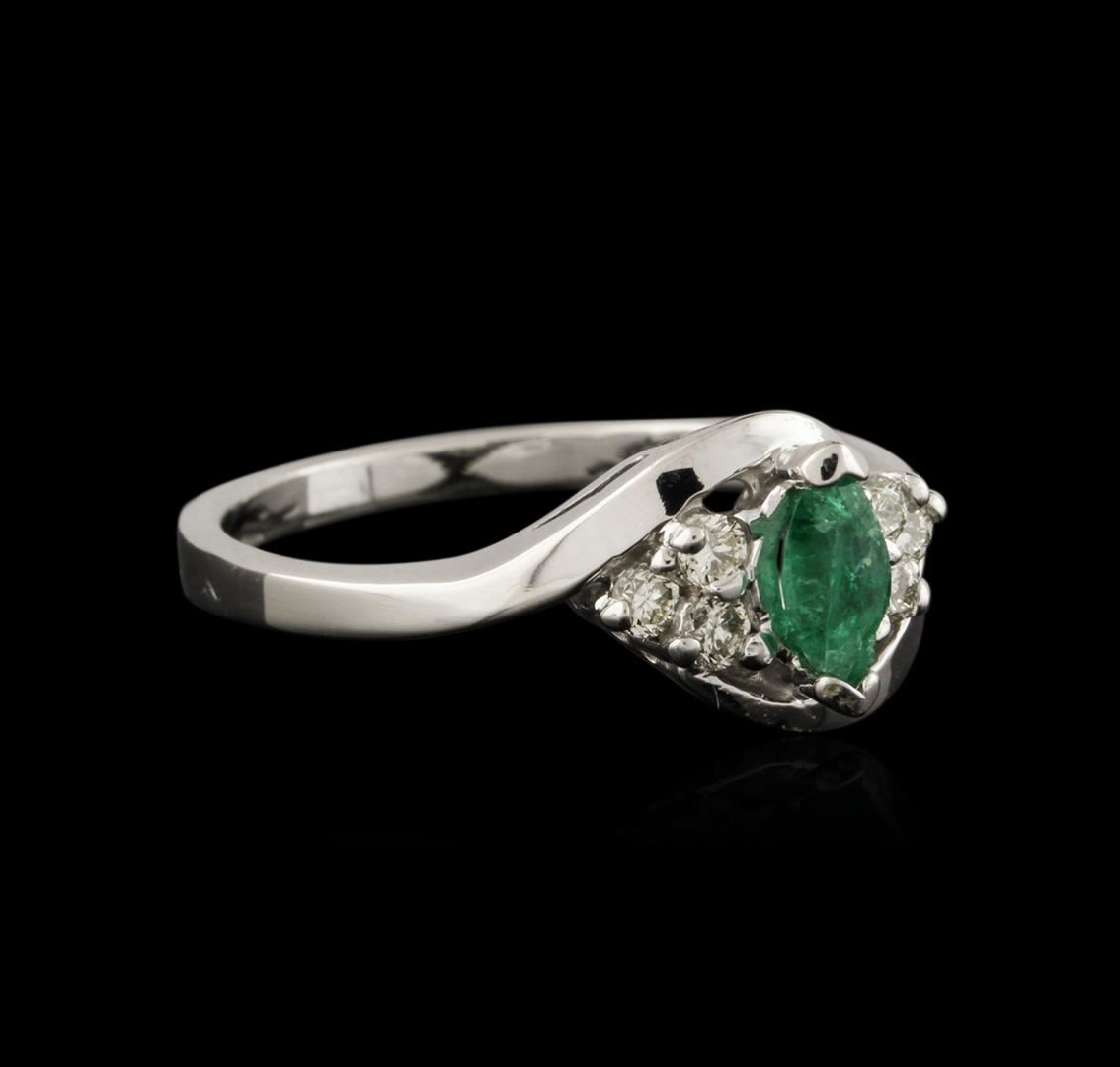 One ring featuring: 14KT white gold weighing 3.12 grams containing one emerald center stone with a total weight of 0.25ct and prong set round diamonds with a total weight of 0.47ct.