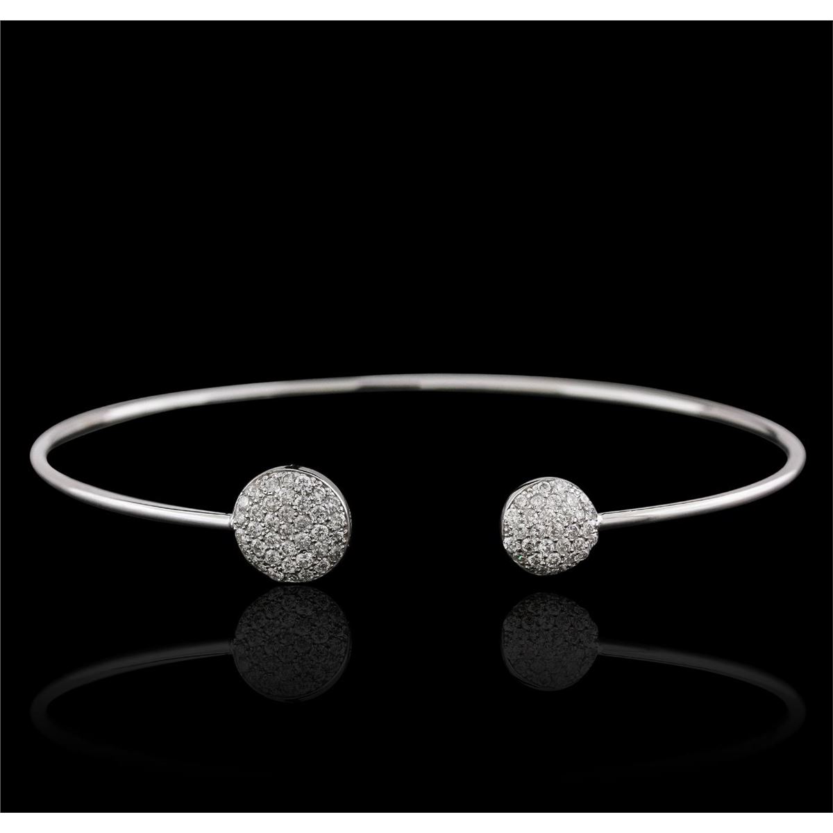 One electronically tested 14KT white gold ladies cast diamond bangle bracelet with a bright polish finish. Condition is new. Containing: Sixty-Eight bead set round brilliant cut diamonds, measuring 1.00 - 1.00 x 0.60mm (depth est.) approximate total weight of 68 Stones = 0.25ct. Clarity: I-1 to I-3. Color: H - I, Cut is Good. All diamonds are graded in the mounting, unless otherwise stated. Total Weight of Diamonds 0.25ct. Total Weight of Bangle Bracelet 5.30 grams. GGL Appraised at $3,025.00.