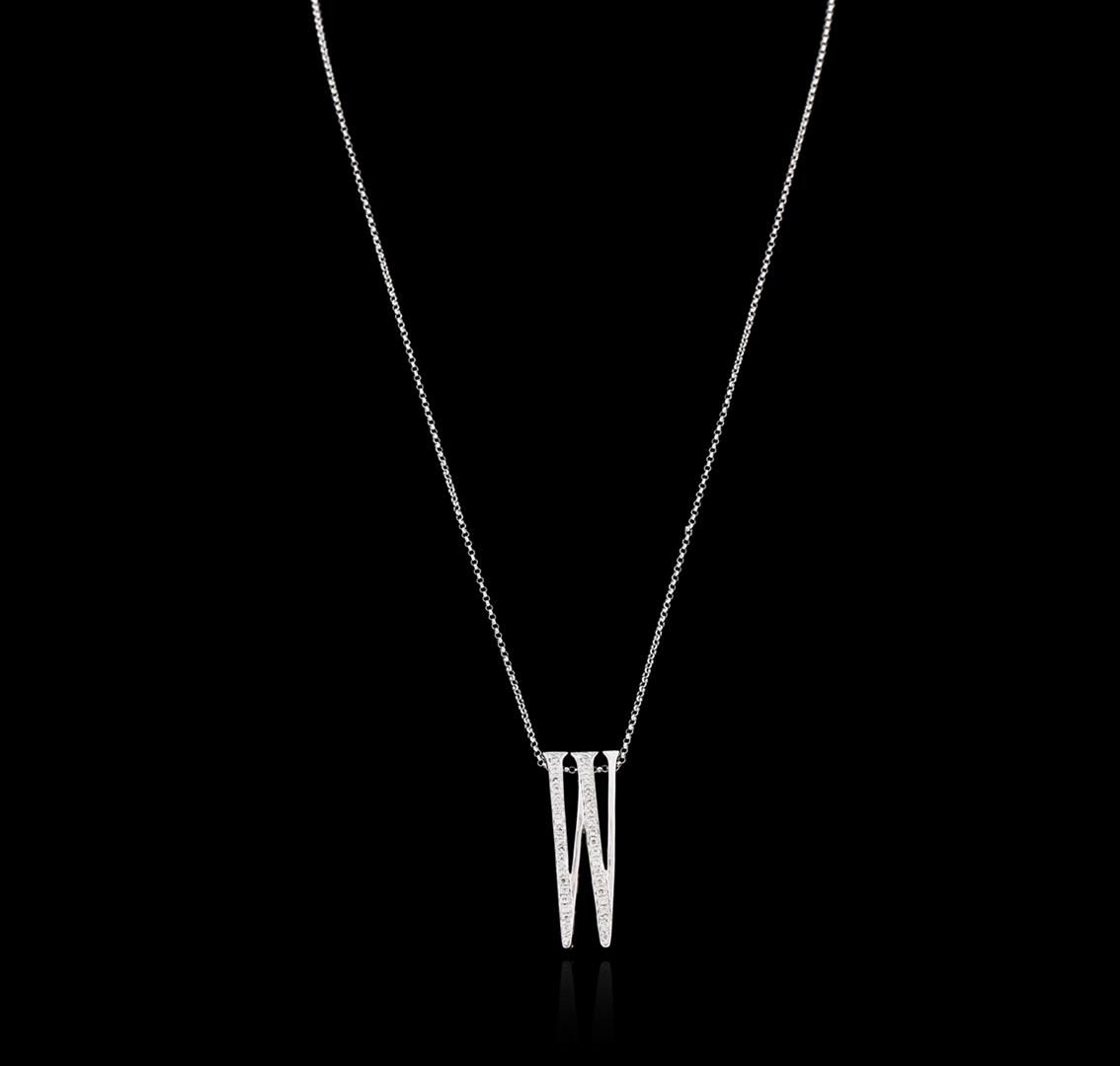One pendant with chain resembling the letter W featuring: 14KT white gold weighing 5.80 grams containing diamonds with a total weight of 0.25ct.