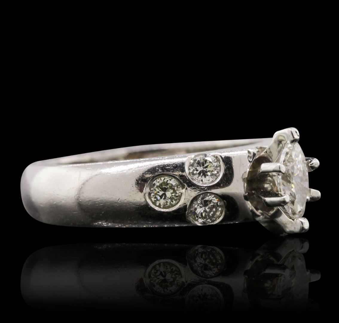 One electronically tested 14KT white gold ladies cast & assembled diamond unity ring with a bright polish finish. Condition is new, good workmanship. The featured diamond is supported by diamond set shoulders and completed by a three and one-half millimeter wide band. Identified with markings of 14K. Containing: One prong set marquise shaped cut diamond, measuring 5.80 x 3.20 x 2.02mm (depth est.) approximate weight of 0.26ct with a strong blue fluorescence. Graded in the setting. Clarity: SI-2. Color: H. Depth: 63.1%. Table: 56.3%. Six flush set round brilliant cut diamonds, measuring 2.30 - 2.20 x 1.35mm (depth est.) approximate total weight of 6 stones = 0.31ct. Graded in the setting. Clarity: SI-1 to SI-2. Color: H-J. Total Weight of Diamonds 0.57ct. Total Weight of Ring 5.50 grams. AIG Appraised at $2,935.00.