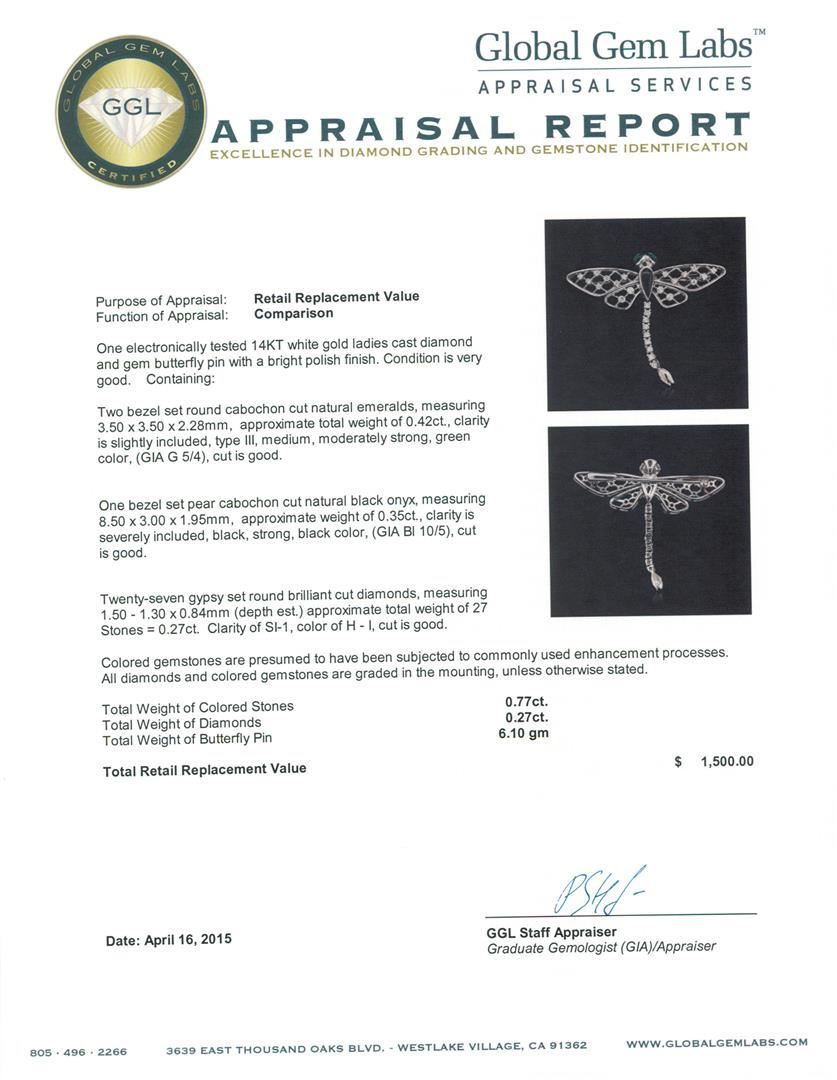 One electronically tested 14KT white gold ladies cast diamond and gem butterfly pin with a bright polish finish. Condition is very good. Containing: Two bezel set round cabochon cut natural emeralds, measuring 3.50 x 3.50 x 2.28mm, approximate total weight of 0.42ct., clarity is slightly included, type III, medium, moderately strong, green color, (GIA G 5/4), cut is good. One bezel set pear cabochon cut natural black onyx, measuring 8.50 x 3.00 x 1.95mm, approximate weight of 0.35ct., clarity is severely included, black, strong, black color, (GIA Bl 10/5), cut is good. Twenty-Seven gypsy set round brilliant cut diamonds, measuring 1.50 - 1.30 x 0.84mm (depth est.) approximate total weight of 27 Stones = 0.27ct. Clarity: SI-1. Color: H - I, Cut is Good. Colored gemstones are presumed to have been subjected to commonly used enhancement processes. All diamonds and colored gemstones are graded in the mounting, unless otherwise stated. Total Weight of Colored Stones 0.77ct. Total Weight of Diamonds 0.27ct. Total Weight of Butterfly Pin 6.10 grams. GGL Appraised at $1,500.00.