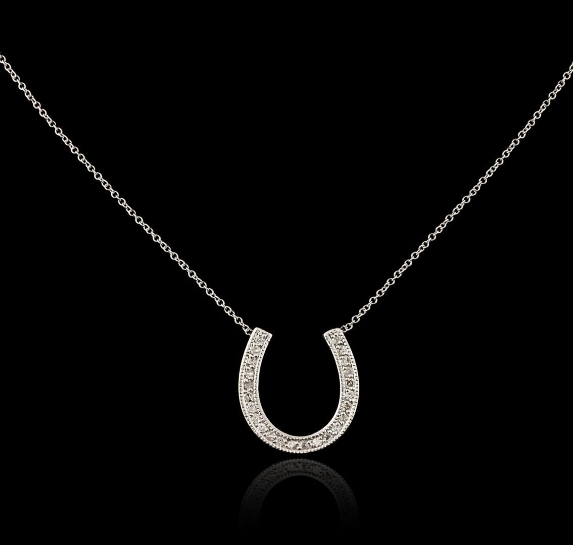 One horse shoe pendant with chain featuring: 14KT white gold weighing 3.58 grams containing pave set round diamonds with a total weight of 0.29ct.