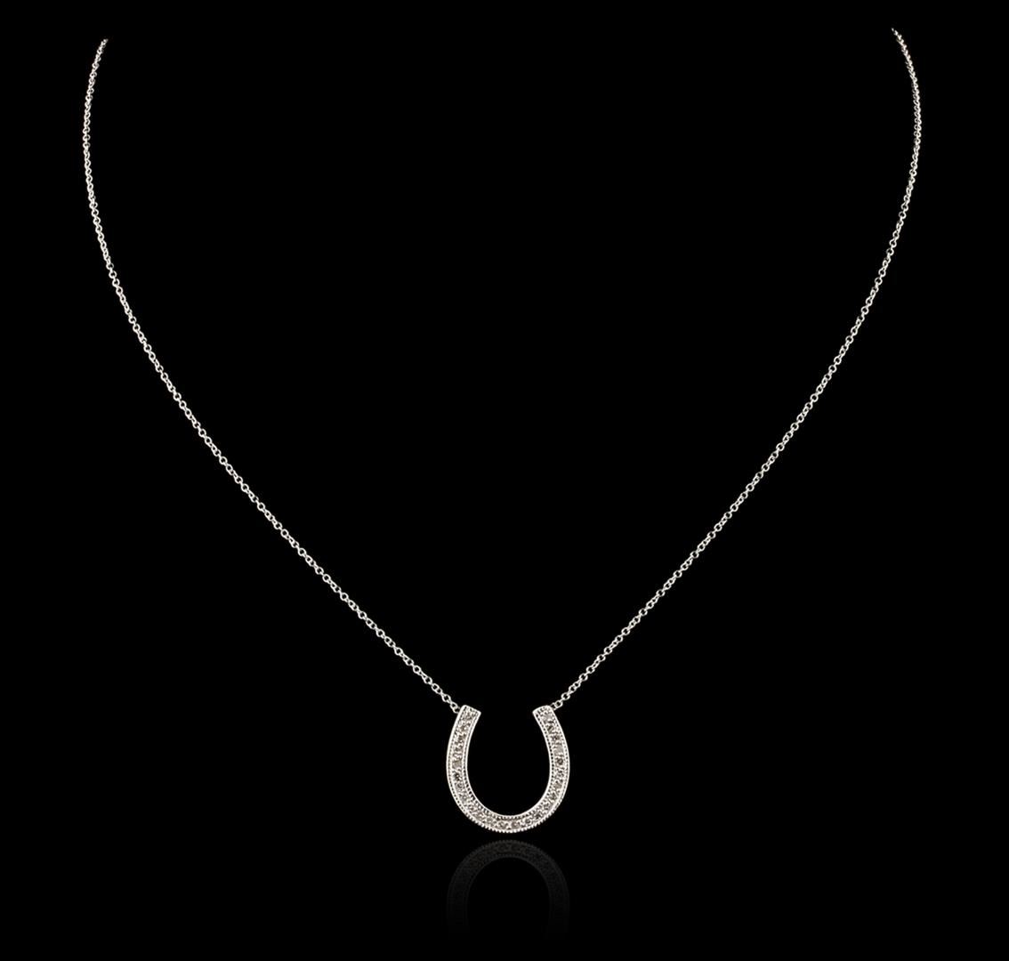 One horse shoe pendant with chain featuring: 14KT white gold weighing 3.58 grams containing pave set round diamonds with a total weight of 0.29ct.