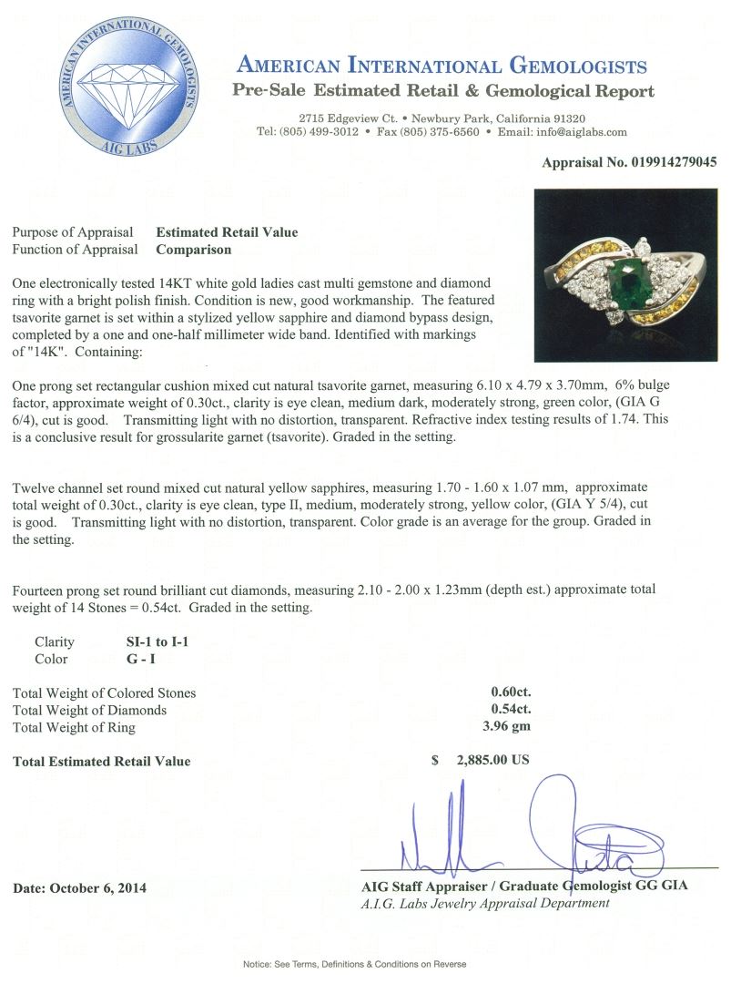 One electronically tested 14KT white gold ladies cast multi gemstone and diamond ring with a bright polish finish. The featured tsavorite garnet is set within a stylized yellow sapphire and diamond bypass design, completed by a one and one-half millimeter wide band. Identified with markings of "14K". Condition is new, good workmanship. Containing: One prong set rectangular cushion mixed cut natural tsavorite garnet, measuring 6.10 x 4.79 x 3.70mm, 6%. bulge factor, approximate weight of 0.30ct., clarity is eye clean, medium dark, moderately strong, green color, (GIA G 6/4), cut is good. Transmitting light with no distortion, transparent. Refractive index testing results of 1.74. This is a conclusive result for grossularite garnet (tsavorite). Graded in the setting. Twelve channel set round mixed cut natural yellow sapphires, measuring 1.70 - 1.60 x 1.07 mm, approximate. Total Weight of 0.30ct., clarity is eye clean, type II, medium, moderately strong, yellow color, (GIA Y 5/4), cut is good. Transmitting light with no distortion, transparent. Color grade is an average for the group. Graded in the setting. Fourteen prong set round brilliant cut diamonds, measuring 2.10 - 2.00 x 1.23mm (depth est.) approximate. Total Weight of 14 Stones = 0.54ct. Graded in the setting. Clarity: SI-1 to I-1. Color: G - I. Total Weight of Colored Stones 0.60ct. Total Weight of Diamonds 0.54ct. Total Weight of Ring 3.96gm. AIG Appraised at $2,885.00.