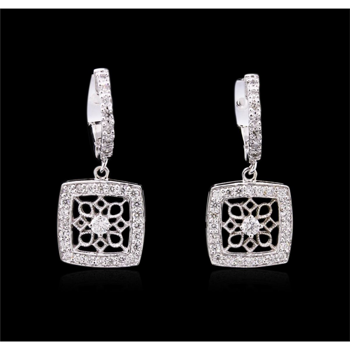 One pair electronically tested 14KT white gold ladies cast diamond earrings with hinged clip backs with a bright polish finish. Identified with markings of "K14". Condition is new. Containing: Two prong set round brilliant cut diamonds, measuring 2.20 - 2.20 x 1.32mm (depth est.) approximate total weight of 2 Stones = 0.08ct. Clarity: SI-1. Color: H, Cut is Good. All diamonds are graded in the mounting, unless otherwise stated. Sixty-Two prong set round brilliant cut diamonds, measuring 1.00 - 1.00 x 0.60mm (depth est.) approximate total weight of 62 Stones = 0.22ct. Clarity: SI-2. Color: H, Cut is Good. All diamonds are graded in the mounting, unless otherwise stated. Total Weight of Diamonds 0.30ct. Total Weight of Earrings 5.30 grams. GGL Appraised at $2,840.00.