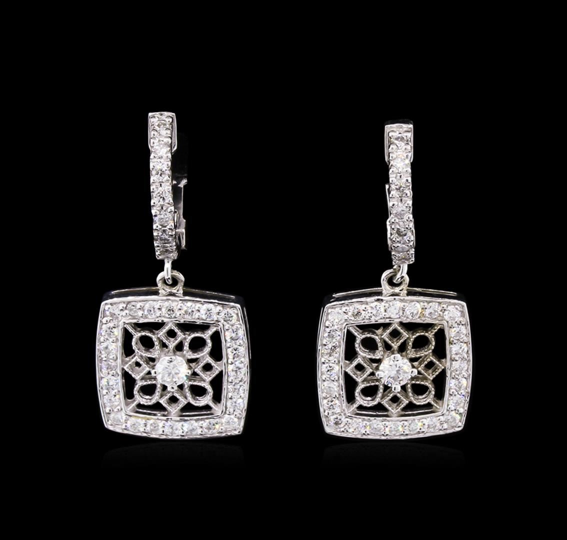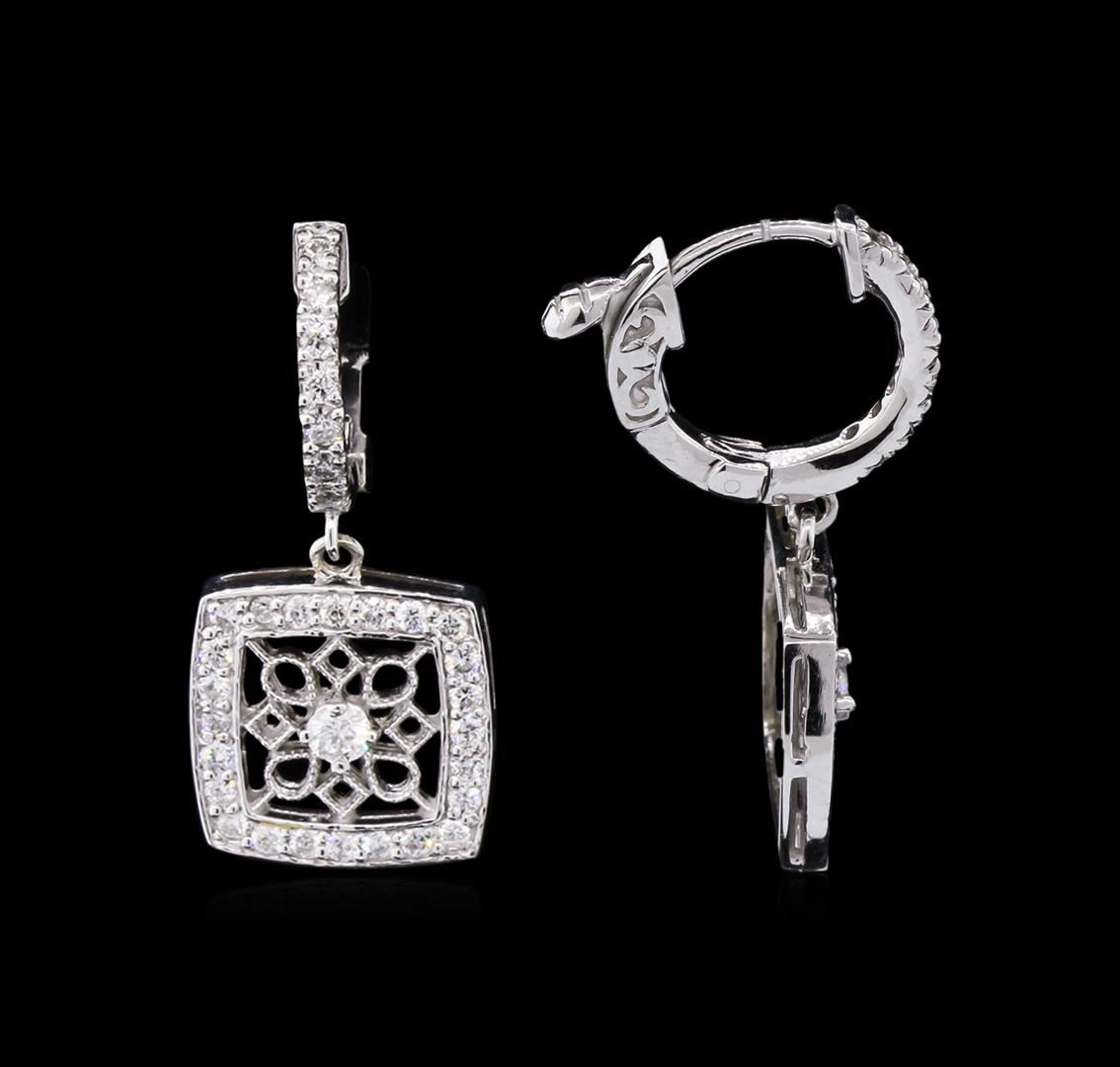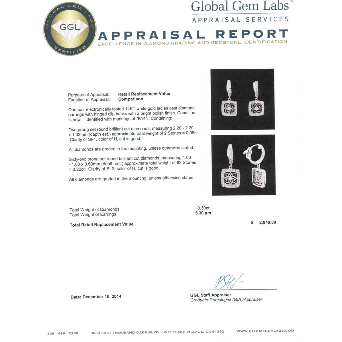 One pair electronically tested 14KT white gold ladies cast diamond earrings with hinged clip backs with a bright polish finish. Identified with markings of "K14". Condition is new. Containing: Two prong set round brilliant cut diamonds, measuring 2.20 - 2.20 x 1.32mm (depth est.) approximate total weight of 2 Stones = 0.08ct. Clarity: SI-1. Color: H, Cut is Good. All diamonds are graded in the mounting, unless otherwise stated. Sixty-Two prong set round brilliant cut diamonds, measuring 1.00 - 1.00 x 0.60mm (depth est.) approximate total weight of 62 Stones = 0.22ct. Clarity: SI-2. Color: H, Cut is Good. All diamonds are graded in the mounting, unless otherwise stated. Total Weight of Diamonds 0.30ct. Total Weight of Earrings 5.30 grams. GGL Appraised at $2,840.00.