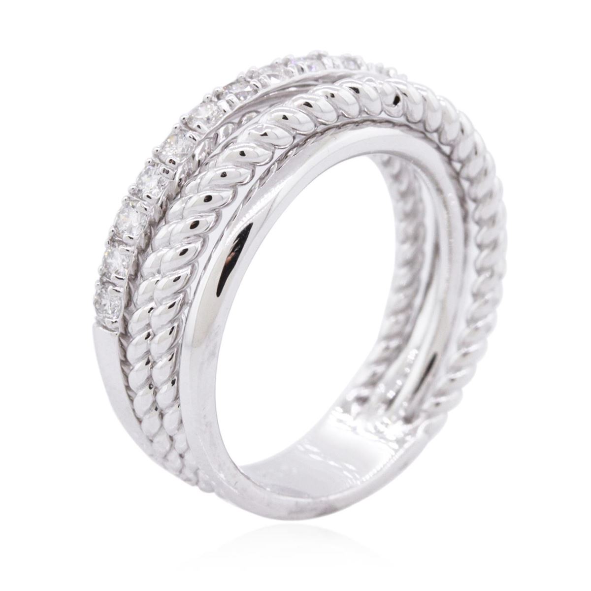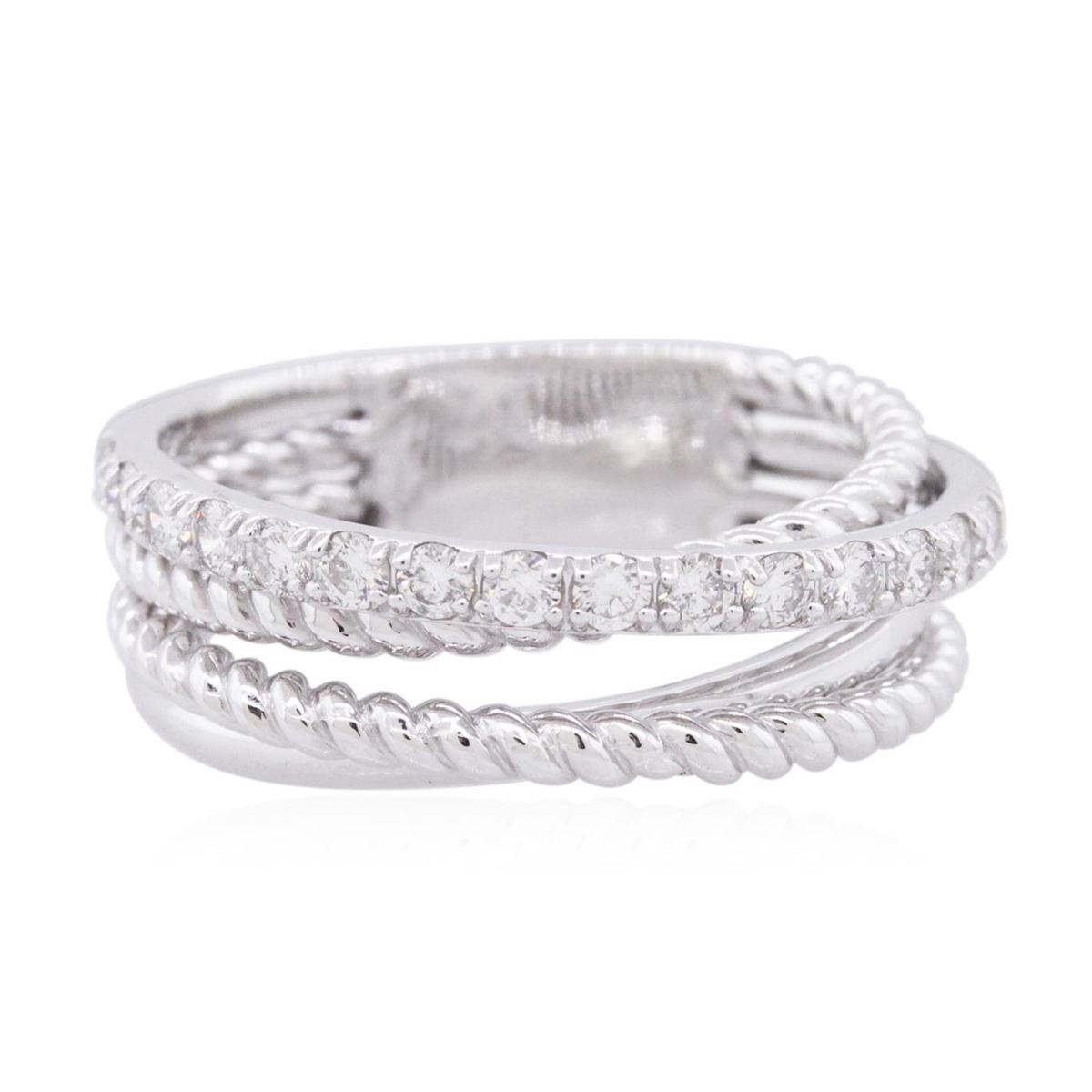 One electronically tested 14KT white gold ladies cast diamond ring with a bright polish finish. Identified with markings of "K14". Condition is new. Containing: Fifteen prong set round brilliant cut diamonds, measuring 1.80 - 1.80 x 1.08mm (depth est.) approximate total weight of 15 Stones = 0.32ct. Clarity: SI-1 to SI-2. Color: I - J, Cut is Good. All diamonds are graded in the mounting, unless otherwise stated. Total Weight of Diamonds 0.32ct. Total Weight of Ring 5.70 grams. GGL Appraised at $2,835.00.