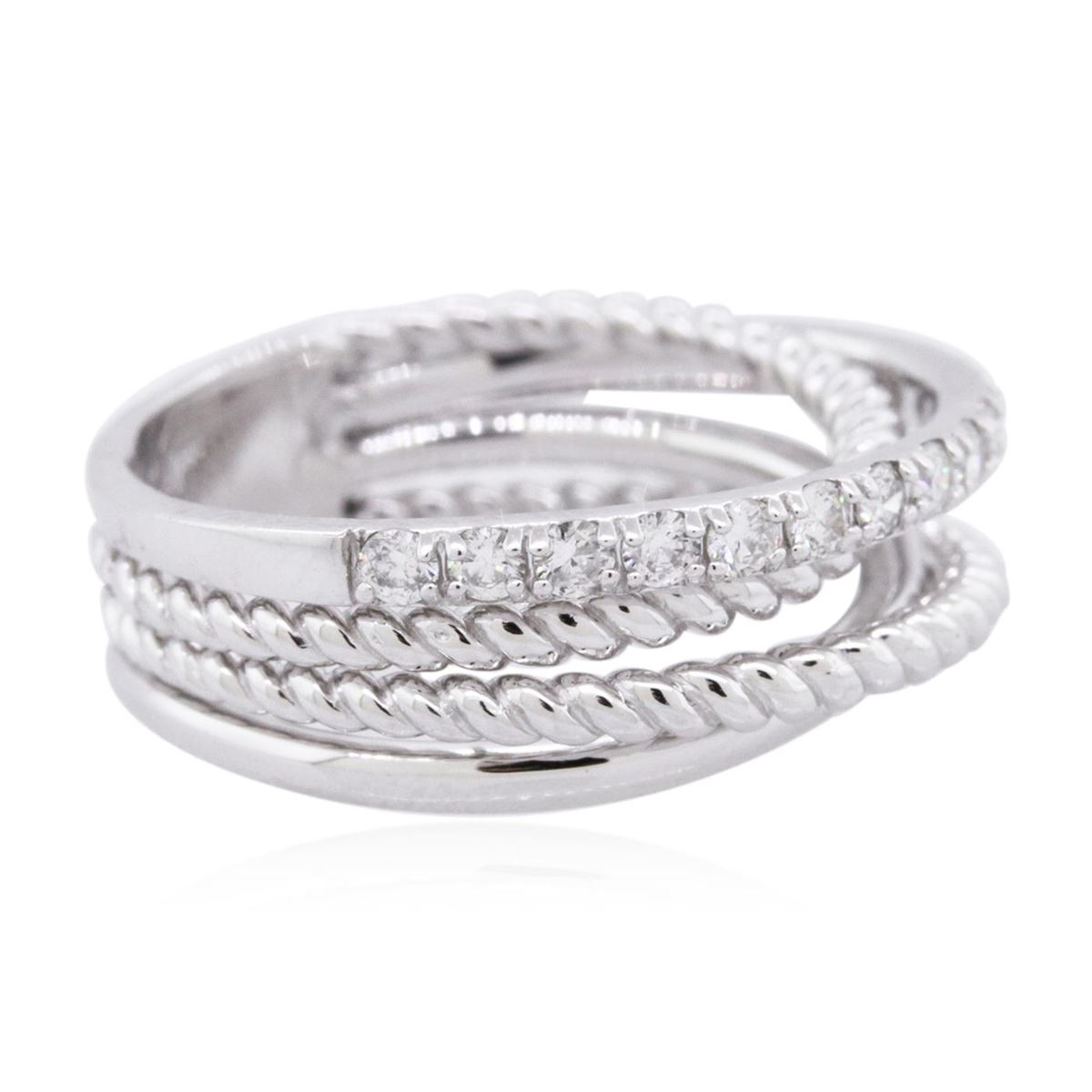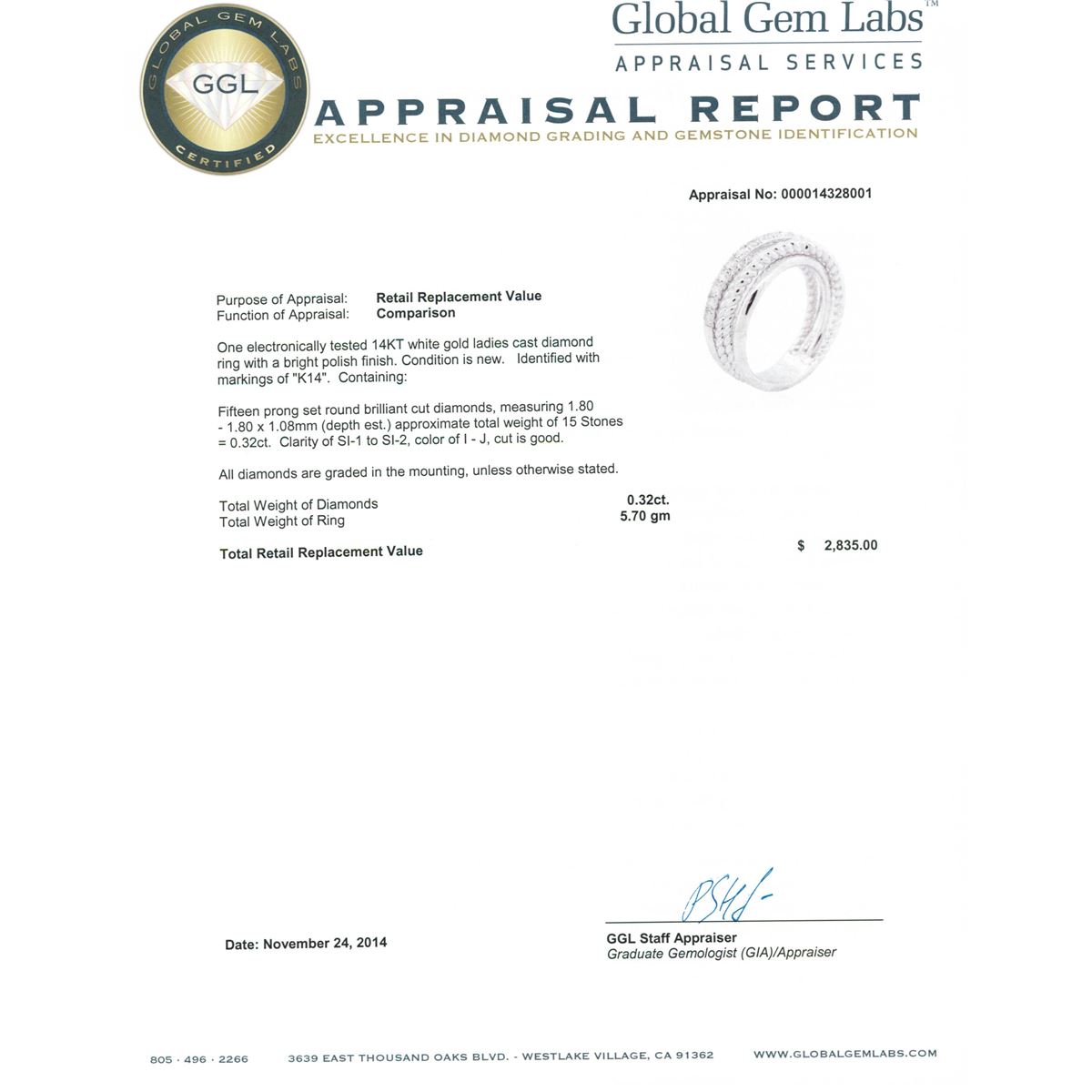 One electronically tested 14KT white gold ladies cast diamond ring with a bright polish finish. Identified with markings of "K14". Condition is new. Containing: Fifteen prong set round brilliant cut diamonds, measuring 1.80 - 1.80 x 1.08mm (depth est.) approximate total weight of 15 Stones = 0.32ct. Clarity: SI-1 to SI-2. Color: I - J, Cut is Good. All diamonds are graded in the mounting, unless otherwise stated. Total Weight of Diamonds 0.32ct. Total Weight of Ring 5.70 grams. GGL Appraised at $2,835.00.