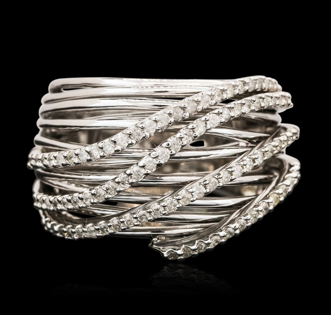 One electronically tested 14KT white gold ladies combination cast & assembled diamond ring with a bright polish finish. Identified with markings of "K14". Condition is new. Containing: Eighty-Eight prong set round brilliant cut diamonds, measuring 1.00 - 1.00 x 0.60mm (depth est.) approximate total weight of 88 Stones = 0.32ct. Clarity: I-1 to I-3. Color: I - J, Cut is Good. All diamonds are graded in the mounting, unless otherwise stated. Total Weight of Diamonds 0.32ct. Total Weight of Ring 10.60 grams. GGL Appraised at $3,960.00.