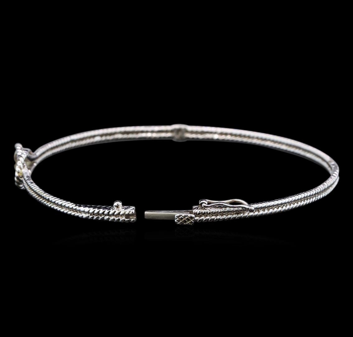One electronically tested 14KT white gold ladies cast diamond bangle bracelet with a hidden box clasp with safety closer with a bright polish finish. Identified with markings of "14K". Condition is very good. Containing: One back setting set round brilliant cut diamond, measuring 4.50 - 4.50 x 2.70mm (depth est.) approximate weight of 0.33ct. Clarity: I-2. Color: I, Cut is Good. All diamonds are graded in the mounting, unless otherwise stated. Total Weight of Diamonds 0.33ct. Total Weight of Bangle Bracelet 7.00 grams. GGL Appraised at $1,405.00.