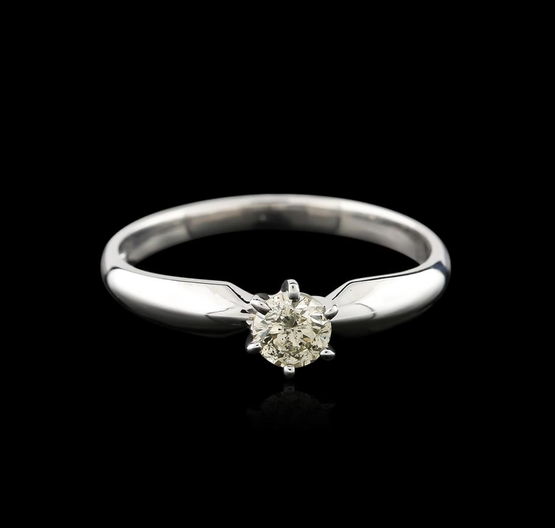 One electronically tested 14KT white gold ladies cast diamond solitaire ring with a half round shank with a bright polish finish. Identified with markings of "14K". Condition is new. Containing: One prong set round brilliant cut diamond, measuring 4.40 - 4.40 x 2.64mm (depth est.) exact weight 0.33ct. Clarity: I-2. Color: L, Cut is Good. Diamonds are graded in the mounting, unless otherwise stated. Total Weight of Diamonds 0.33ct. Total Weight of Solitaire Ring 2.30 grams. GGL Appraised at $845.00.