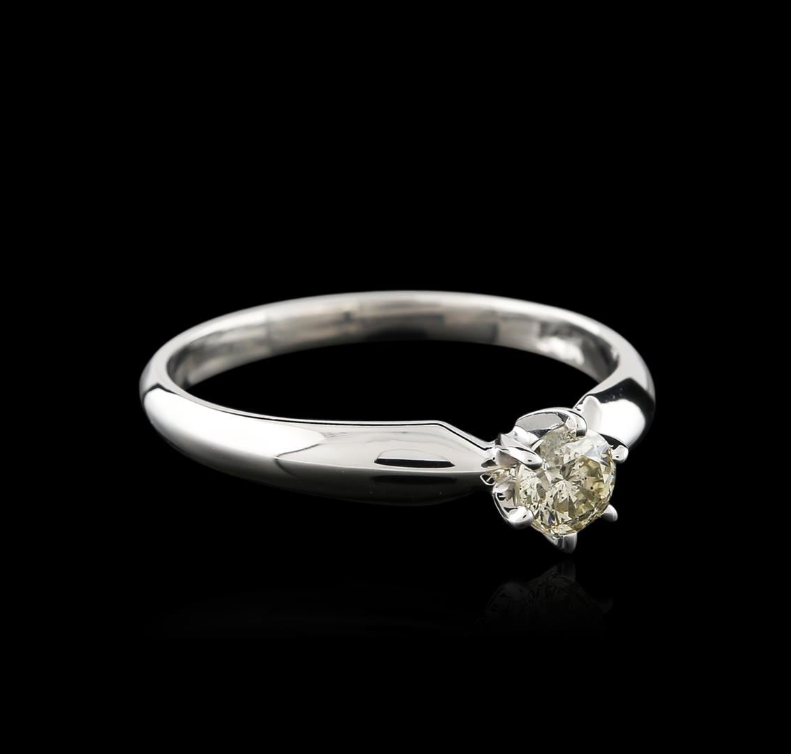One electronically tested 14KT white gold ladies cast diamond solitaire ring with a half round shank with a bright polish finish. Identified with markings of "14K". Condition is new. Containing: One prong set round brilliant cut diamond, measuring 4.40 - 4.40 x 2.64mm (depth est.) exact weight 0.33ct. Clarity: I-2. Color: L, Cut is Good. Diamonds are graded in the mounting, unless otherwise stated. Total Weight of Diamonds 0.33ct. Total Weight of Solitaire Ring 2.30 grams. GGL Appraised at $845.00.