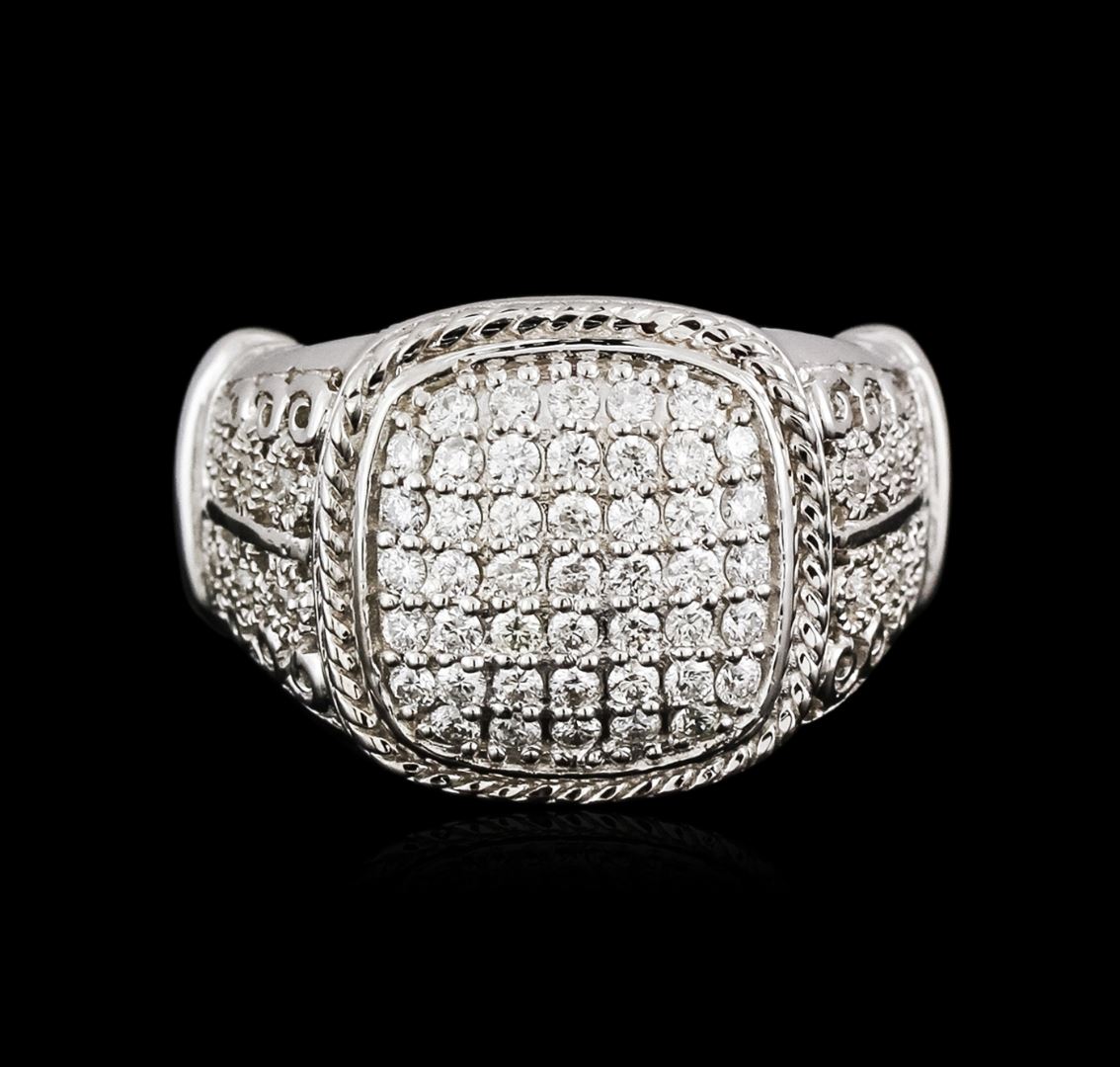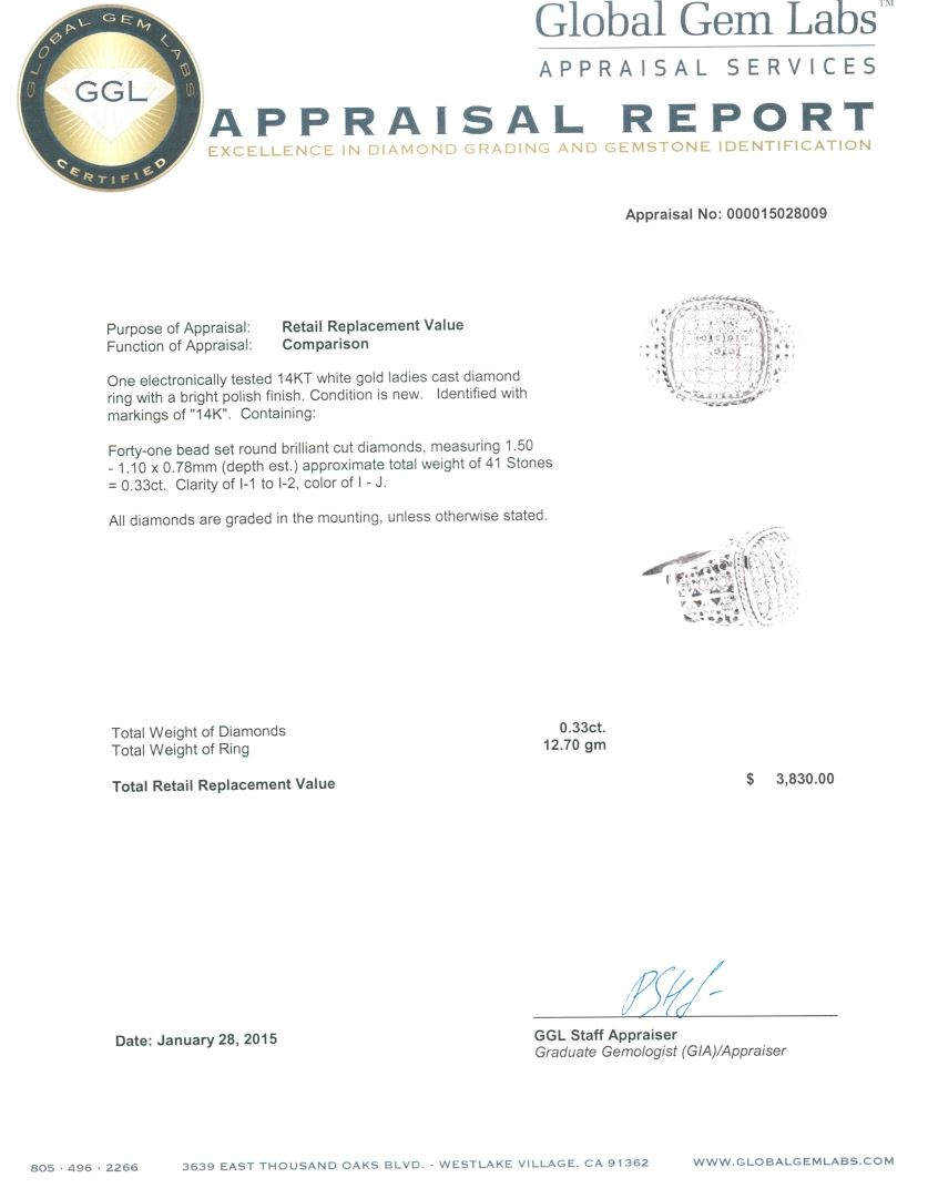 One electronically tested 14KT white gold ladies cast diamond ring with a bright polish finish. Identified with markings of "14K". Condition is new. Containing: Forty-One bead set round brilliant cut diamonds, measuring 1.50 - 1.10 x 0.78mm (depth est.) approximate total weight of 41 Stones = 0.33ct. Clarity: I-1 to I-2. Color: I - J. All diamonds are graded in the mounting, unless otherwise stated. Total Weight of Diamonds 0.33ct. Total Weight of Ring 12.70 grams. GGL Appraised at $3,830.00.