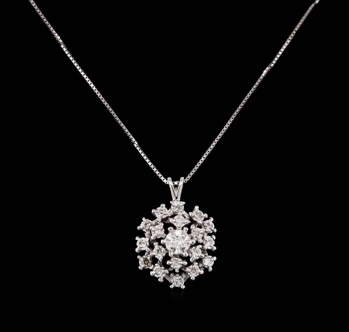 One electronically tested 14KT White Gold ladies cast & assembled diamond pendant with chain. Condition is new, good workmanship. The pendant features an organized diamond Custer, completed by a White Gold split bail. The pendant features an eighteen inch length 14KT White Gold box chain, terminating in a spring ring clasp. Bright polish finish. Containing: Nineteen prong set single cut diamonds, measuring 2.50 - 1.30 x 1.14mm (depth est.) approximate total weight of 19 Stones = 0.35ct. Graded in the setting. Clarity: VS-2 to SI-2. Color: H - J. Total Weight of Diamonds 0.35ct. Total Weight of Pendant 4.42 grams. AIG Appraised at $1,685.00.