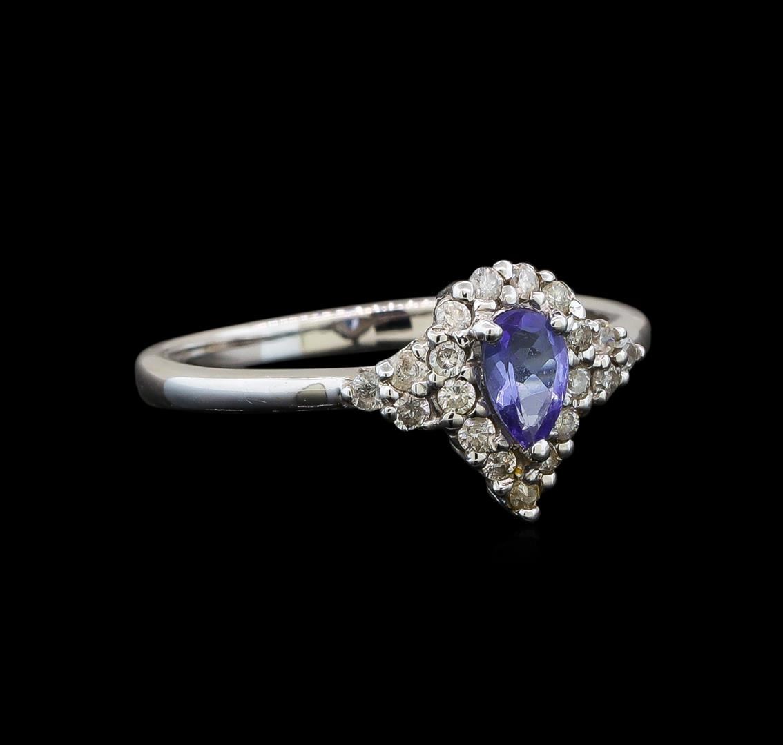 One electronically tested 14KT white gold ladies cast tanzanite and diamond ring with a bright polish finish. Identified with markings of "14K". Condition is new. Containing: One prong set pear modified brilliant cut natural tanzanite, measuring 5.50 x 3.80 x 2.47mm, approximate weight of 0.35ct., clarity is eye clean, type I, medium light, slightly grayish, violet color, (GIA V 4/2), cut is good. Nineteen prong set round brilliant cut diamonds, measuring 1.30 - 1.30 x 0.78mm (depth est.) approximate total weight of 19 Stones = 0.15ct. Clarity: I-1 to I-3. Color: I - J. Colored gemstones are presumed to have been subjected to commonly used enhancement processes. All diamonds and colored gemstones are graded in the mounting, unless otherwise stated. Total Weight of Colored Stones 0.35ct. Total Weight of Diamonds 0.15ct. Total Weight of Ring 2.40 grams. GGL Appraised at $1,120.00.