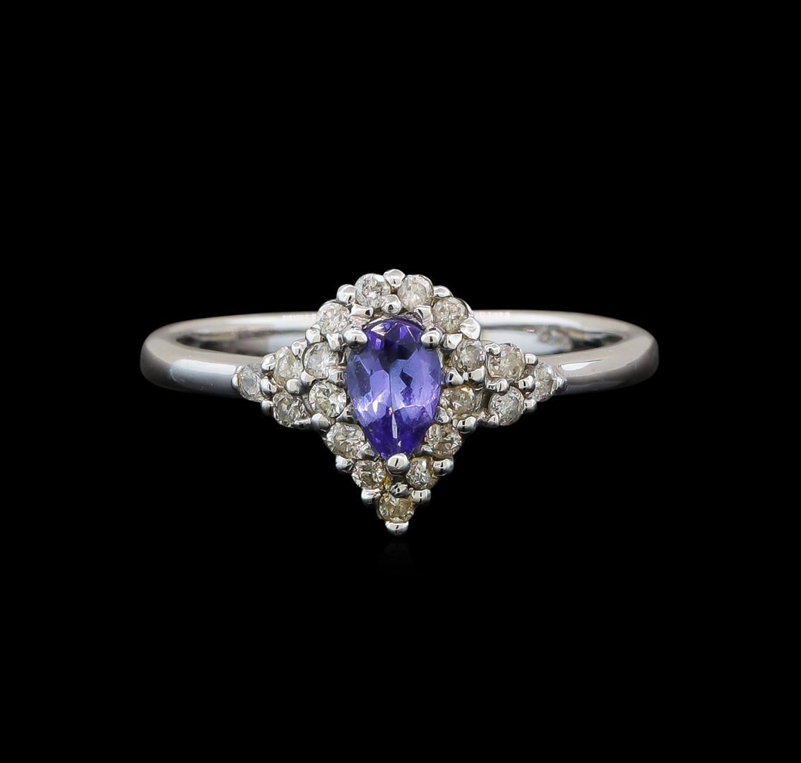 One electronically tested 14KT white gold ladies cast tanzanite and diamond ring with a bright polish finish. Identified with markings of "14K". Condition is new. Containing: One prong set pear modified brilliant cut natural tanzanite, measuring 5.50 x 3.80 x 2.47mm, approximate weight of 0.35ct., clarity is eye clean, type I, medium light, slightly grayish, violet color, (GIA V 4/2), cut is good. Nineteen prong set round brilliant cut diamonds, measuring 1.30 - 1.30 x 0.78mm (depth est.) approximate total weight of 19 Stones = 0.15ct. Clarity: I-1 to I-3. Color: I - J. Colored gemstones are presumed to have been subjected to commonly used enhancement processes. All diamonds and colored gemstones are graded in the mounting, unless otherwise stated. Total Weight of Colored Stones 0.35ct. Total Weight of Diamonds 0.15ct. Total Weight of Ring 2.40 grams. GGL Appraised at $1,120.00.